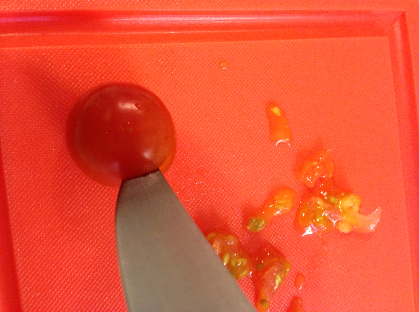 2. Place tomatoes stem side on cutting board and cute a thin slice around the top
