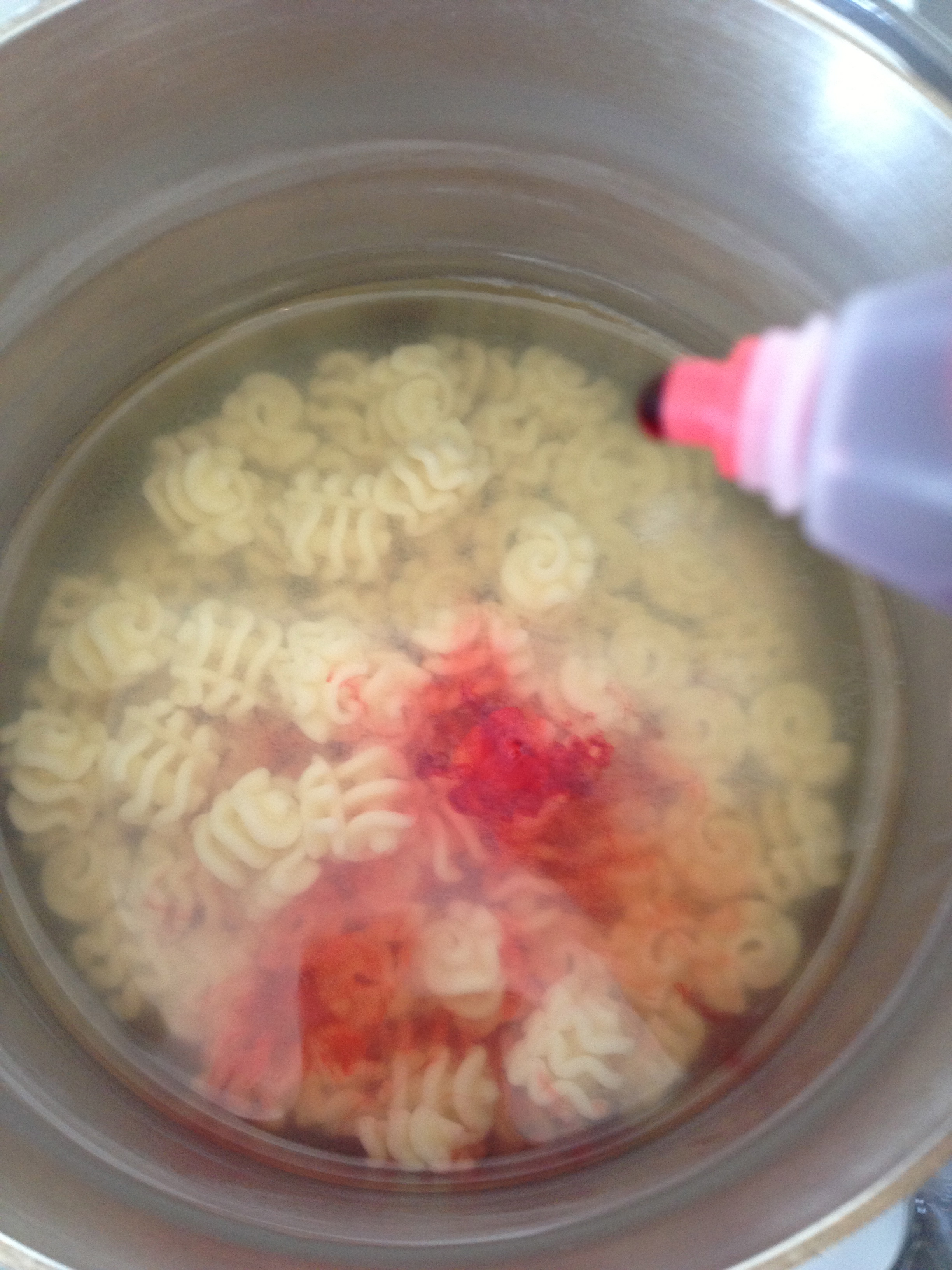 Add pasta to pot of boiling water. Let pasta boil for 5 minutes or so and then add as many drops of red food coloring as you like. The more drops you add the darker red the pasta will be. The fewer drops added, the pinker your pasta will be. Continue to boil pasta till desired tenderness. (the steam from the pot blurred the first picture a bit)