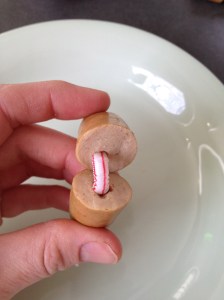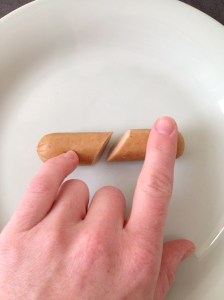 Cut middle of hot dog out at an angle so that you have two end pieces that are about an inch and a half long each. You can make the heart as big as you like by cutting away less of the middle of the hot dog or none at all. Reagan never eats the entire hot dog, so I figured a little hot dog heart would be perfect for her.