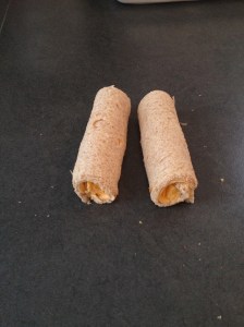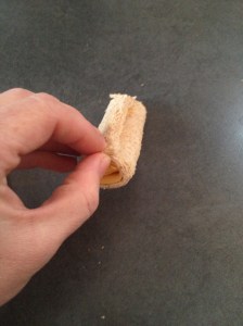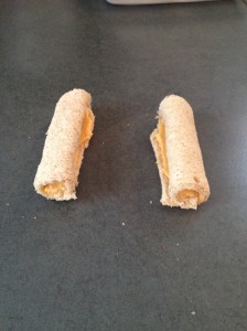 Top bread with one slice of cheese. I have found that if you add too much cheese it’s very hard to roll the bread and the cheese hangs out the sides and burns to the pan when cooking. I actually tore off edges of the cheese slices that were hanging out of the bread roll.
