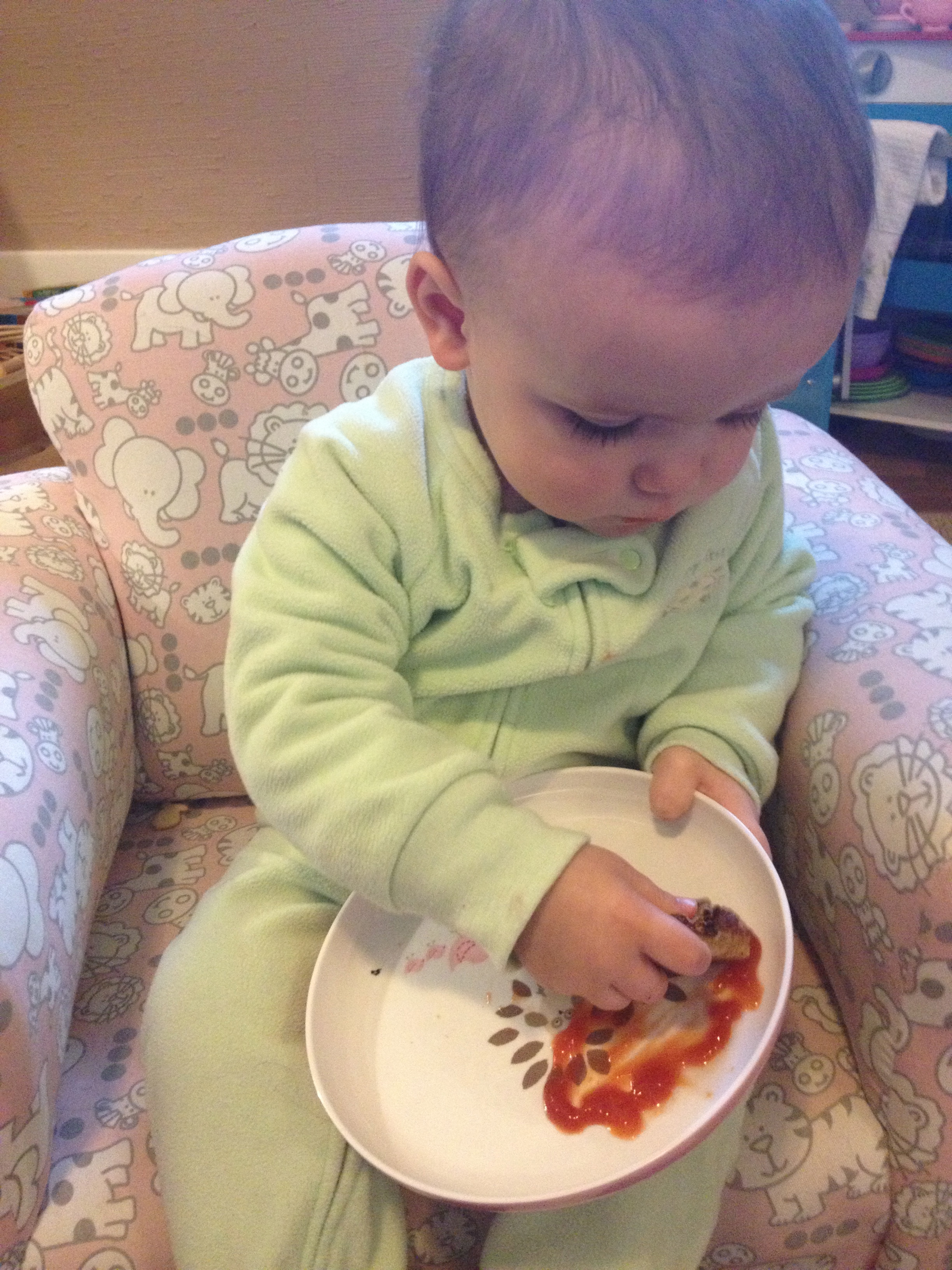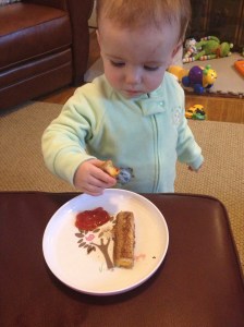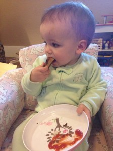 I struggle to find things that Reagan will eat. We offer her everything that we eat and she just isn’t interested in anything a majority of the time. Her diet consists of breast milk, pasta, fruit, wheat bread, peas, yogurt, cheese and snacks (such things as Auntie Anne’s crackers, goldfish crackers, and raisins). Reagan’s pediatrician said that as long as she continues to gain weight and is still breast-feeding, she’s fine and is getting what she needs. Finding different ways to present food to Reagan, that she actually likes, has been a process. I’m trying to make eating fun, I want her to enjoy it…but not too much.