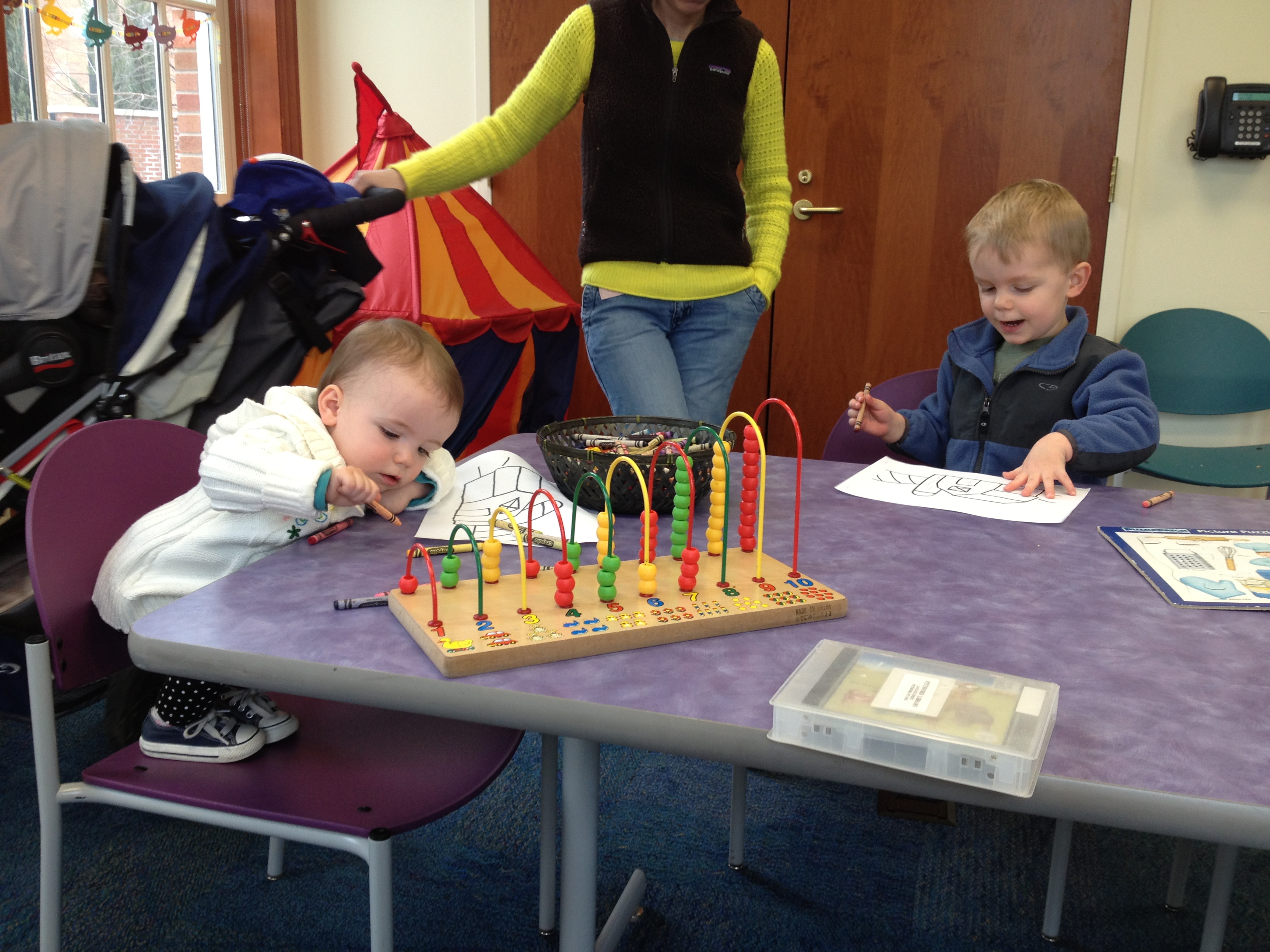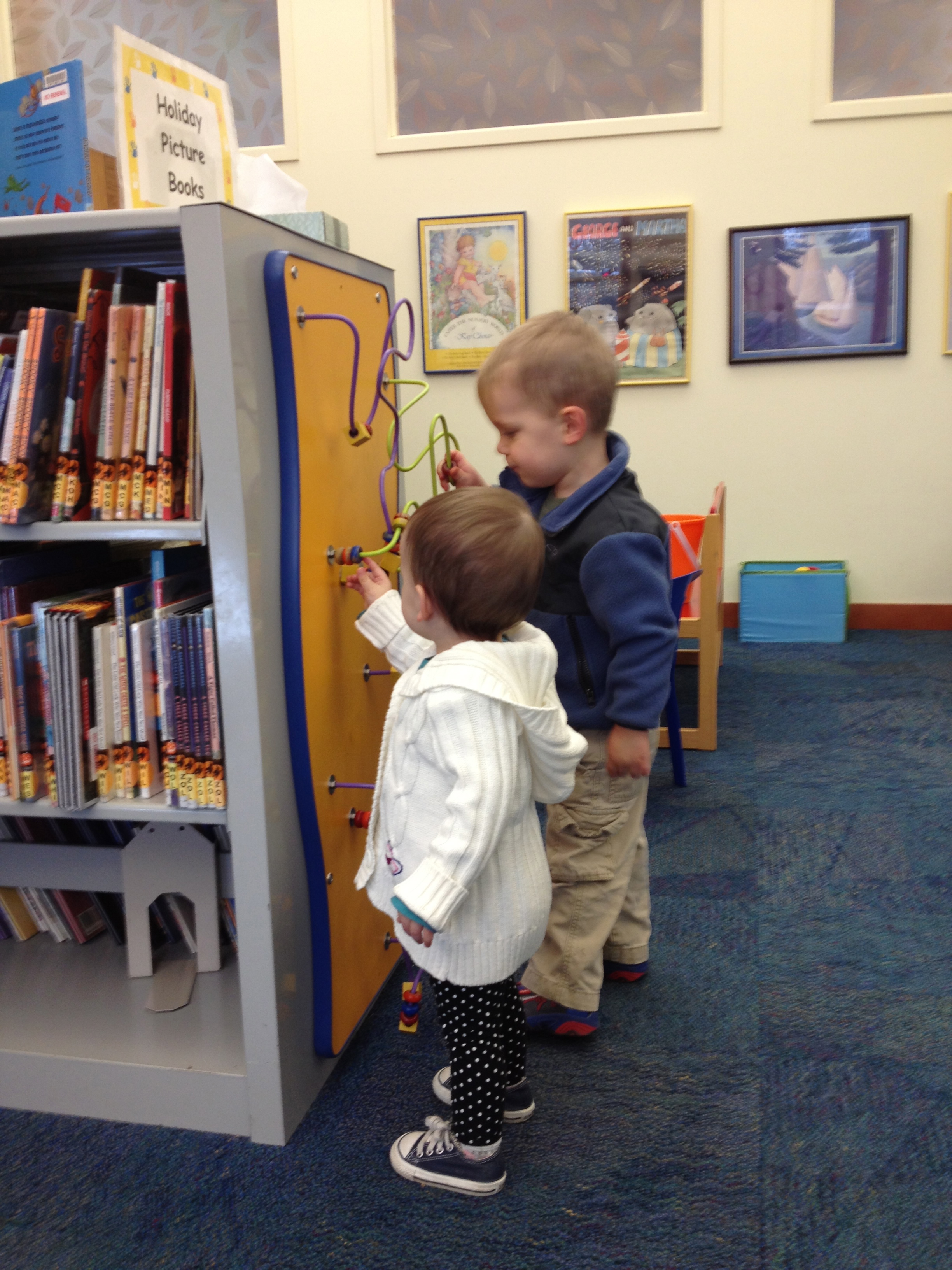 The library is a comfortable and familiar place for both kids. They know their boundaries and enjoy being able to have a bit of freedom to choose what they would like to do. They stuck together today…