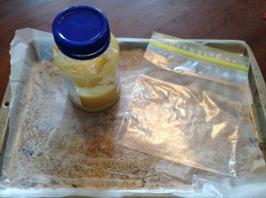 Line baking sheet with wax paper and pour apple sauce, enough for as many drops as you want, into the plastic bag.