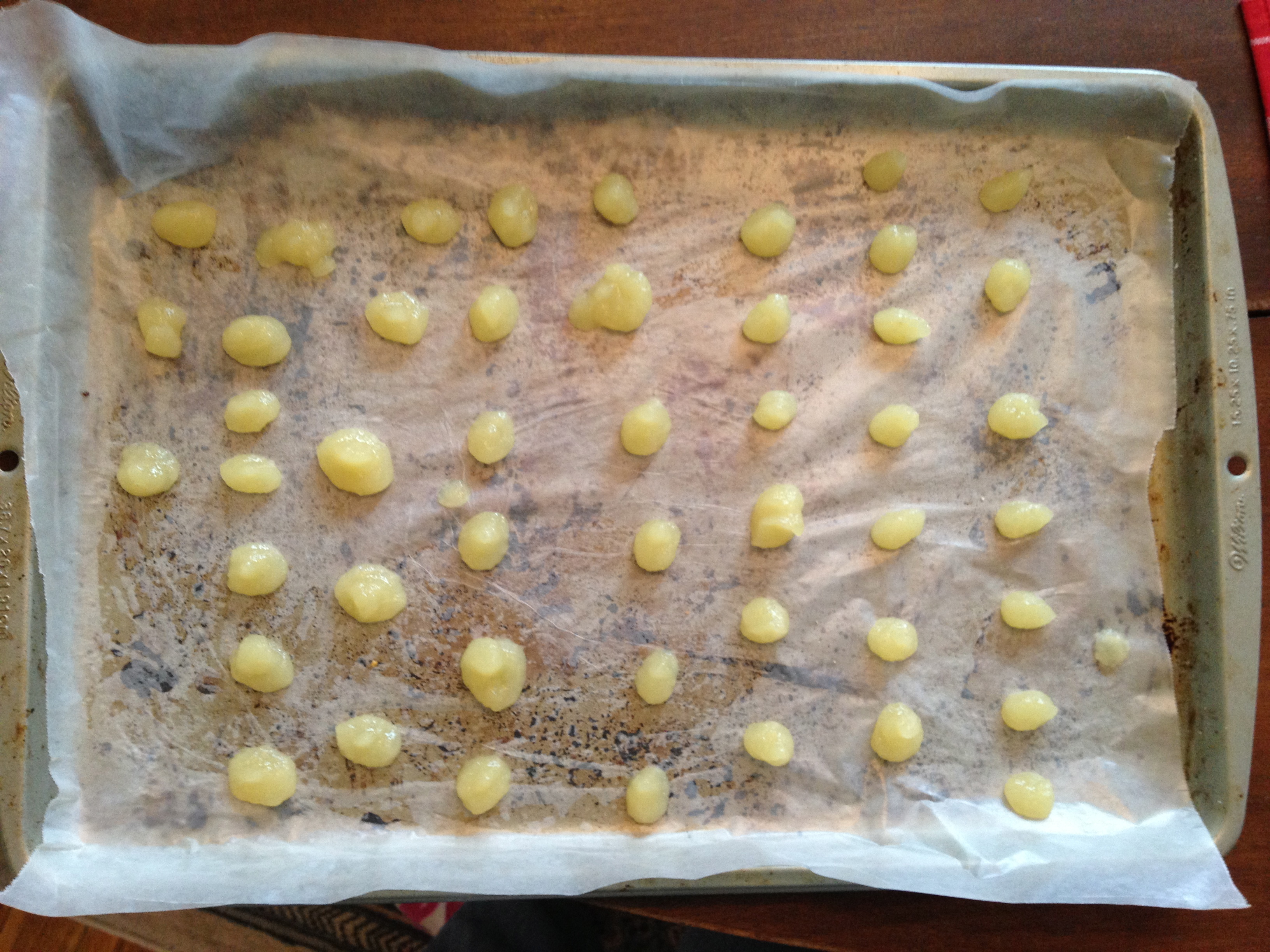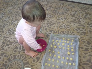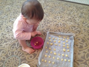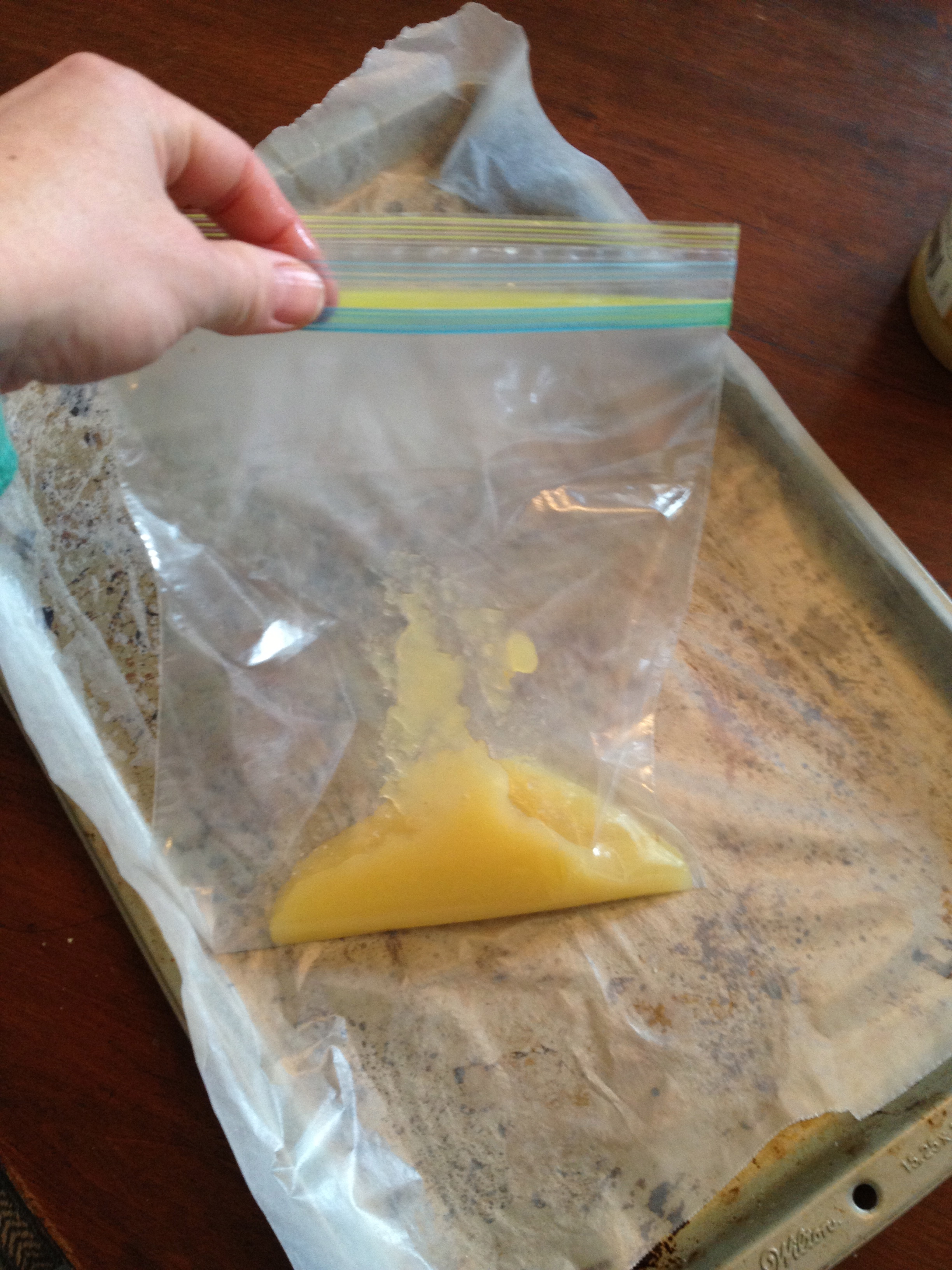Hold plastic bag like a pastry bag and squeeze the desired sized drops onto the wax paper lined baking sheet. I make them big enough for Reagan to pick up, but small enough so that she does not choke.