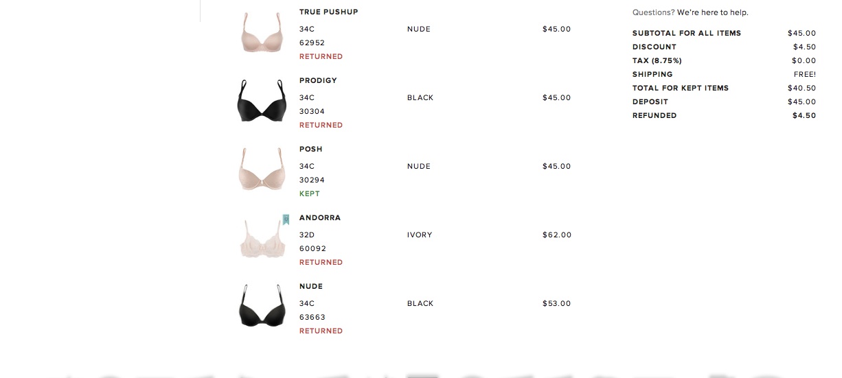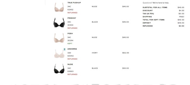 You pay a $48 deposit and they ship you the bras you chose! You have 7 days to try on the bras in the comfort of your own home. Keep the bras you want, return the bras you don’t. Print out and attach their return shipping label to the box that the bras arrived in–NO RETURN SHIPPING FEE!!! Pure awesomeness!!