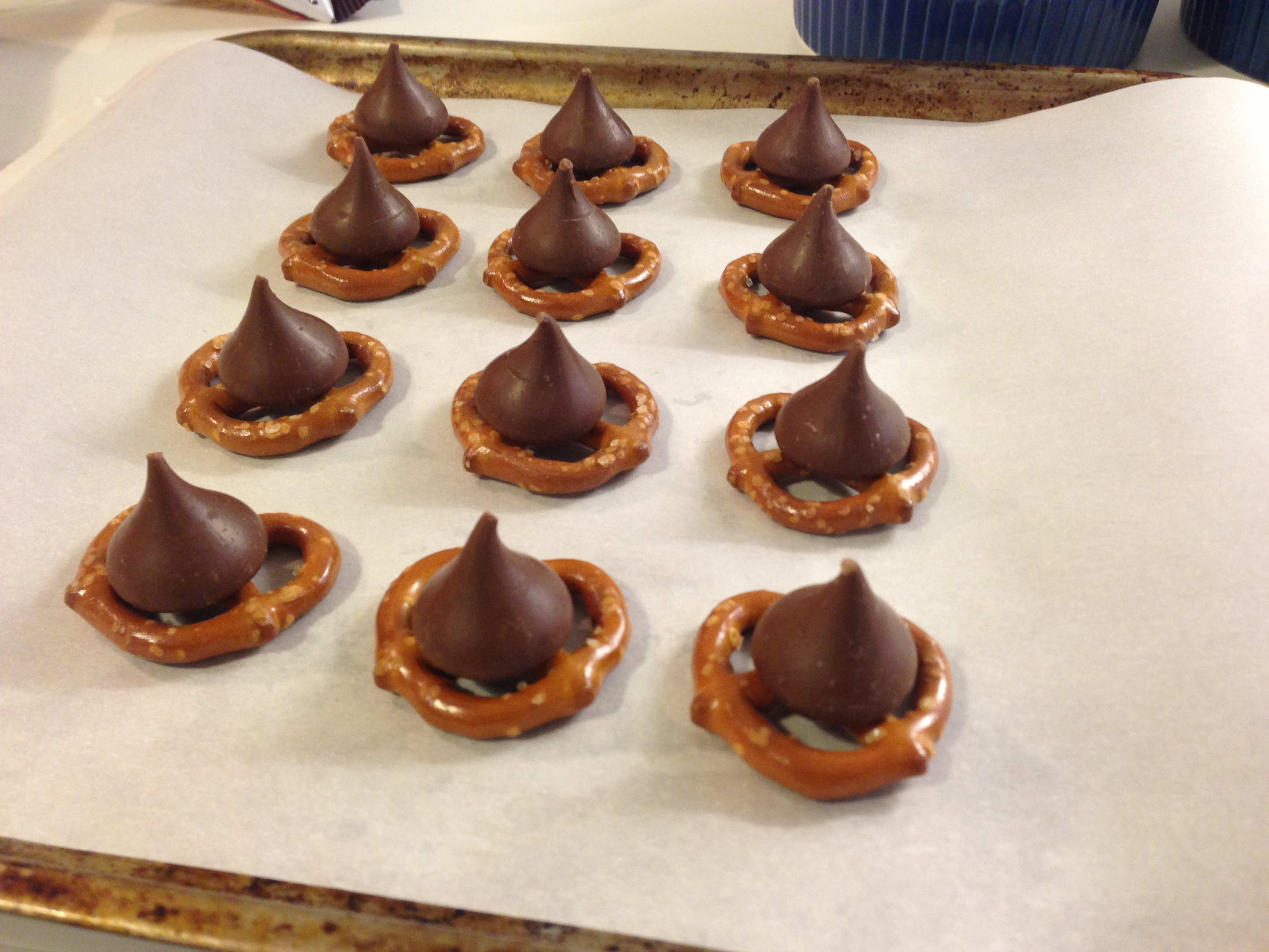 Place a Hershey Kiss in the center of each pretzel. Bake at 200 for about 7 minutes. You want the chocolate to be soft so you can easily put the M&M’s in place but you don’t want it to be melted. As all ovens are different, keep an eye on your first batch.
