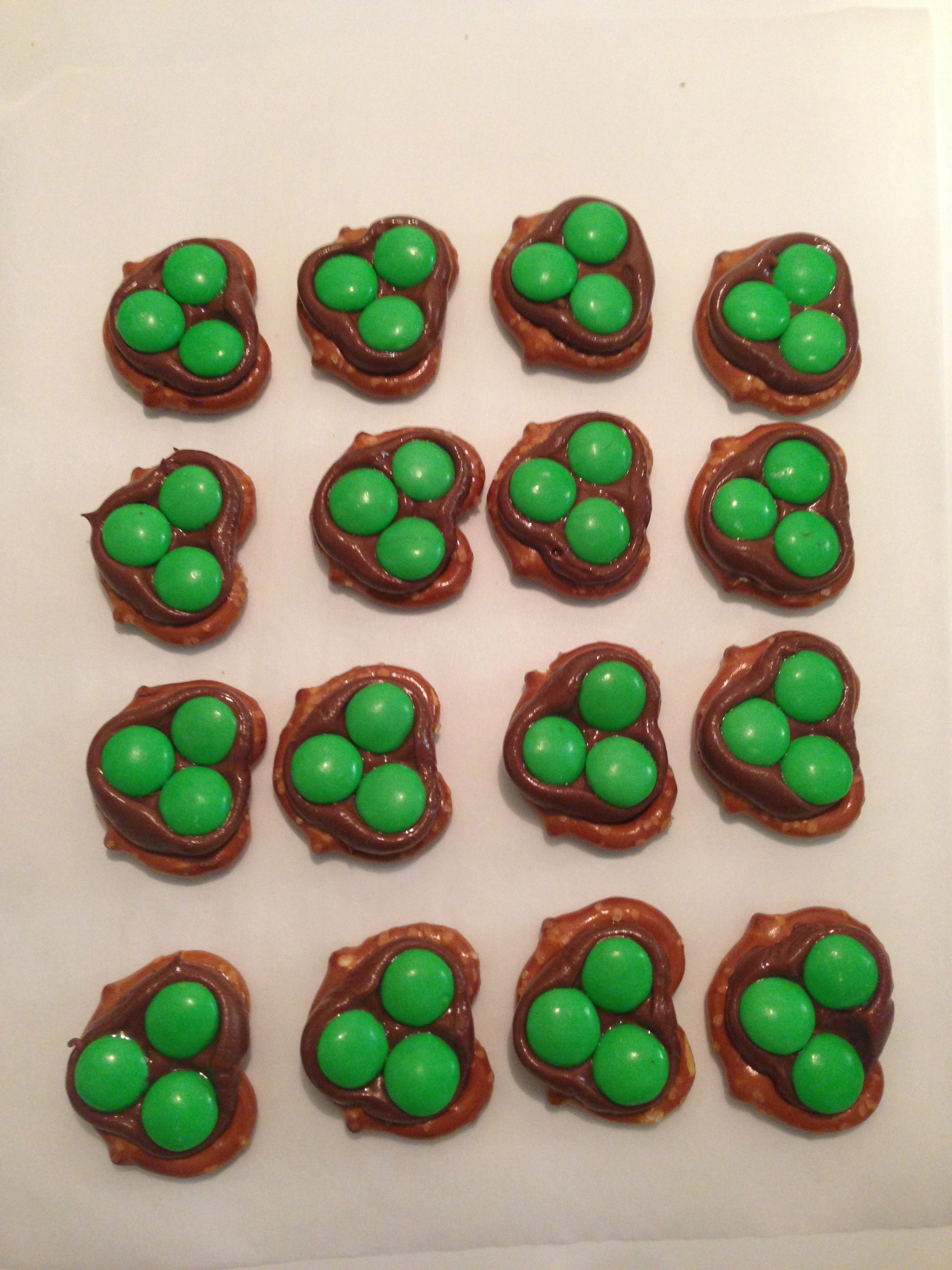 I made these are a few months back to celebrate St. Patrick’s Day at a shindig that a friend was hosting. Even though I missed the boat on posting them for the holiday, these bite size treats could be made year round for a variety of festivities using the other M & M colors. Many of the pins I saw on Pinterest showed these snacks with an icing stem to make them look more like shamrocks. In the end I chose not to using the icing because it didn’t harden and would make transport difficult.