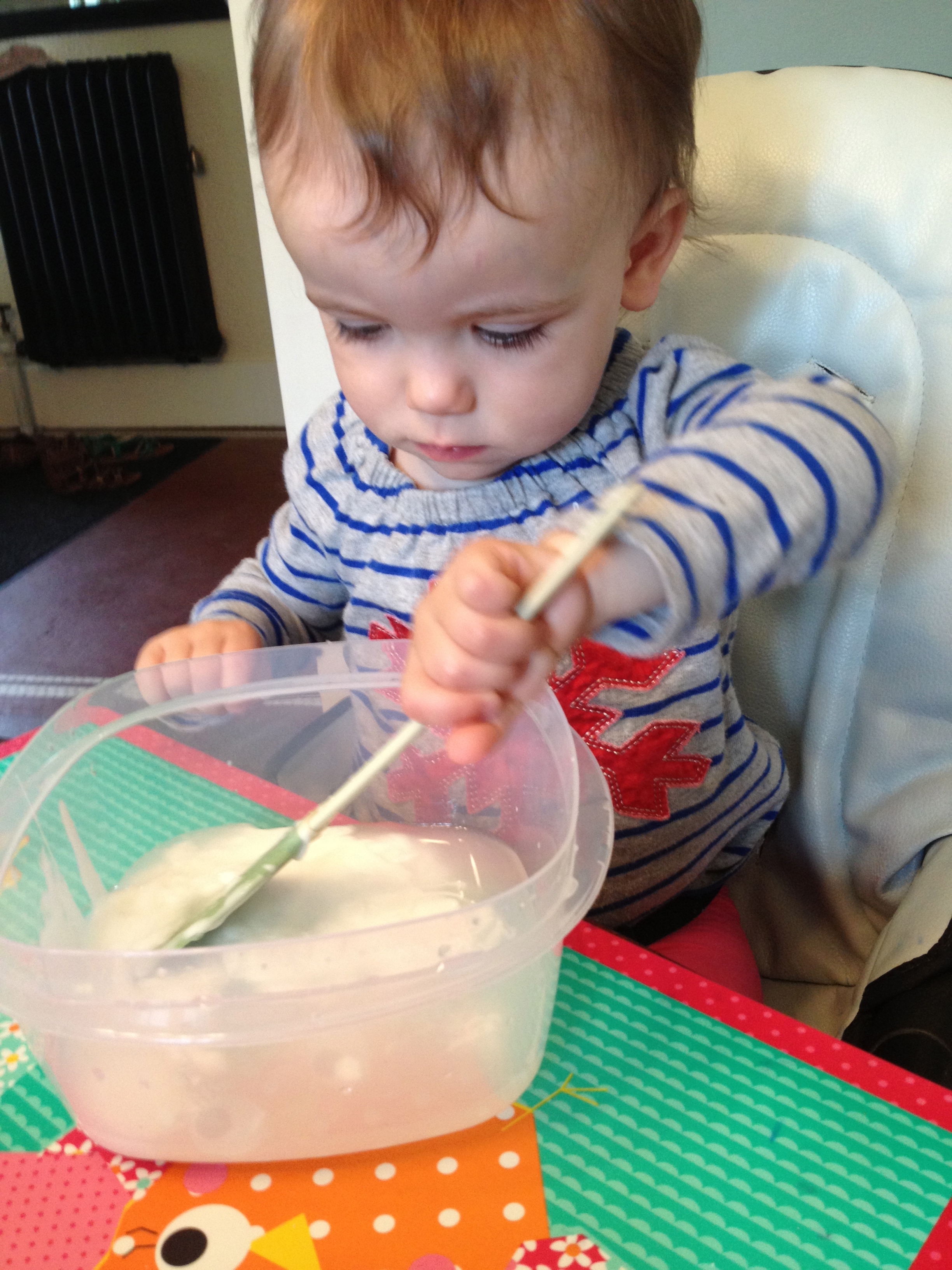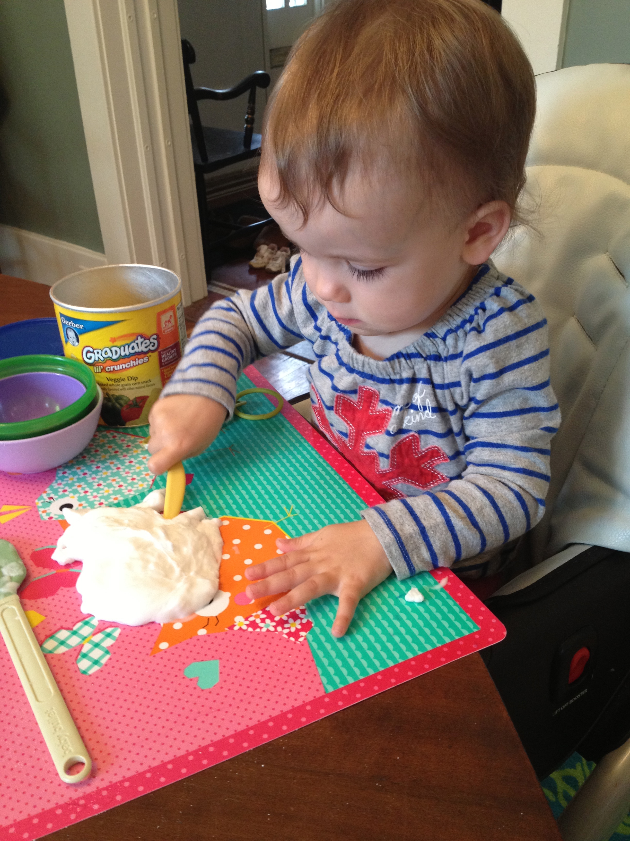 Our slime turned out to be more of a silly putty texture than a slime texture.  I was totally picturing the final product being something ooey and gooey, kinda like the Ghost Buster Slime…which this turned out to be nothing like…bummer.  The putty texture was interesting and was one that Reagan had never felt before.  She really enjoyed the new texture and had fun cutting off pieces, rolling them into balls and serving them for us as a snack!