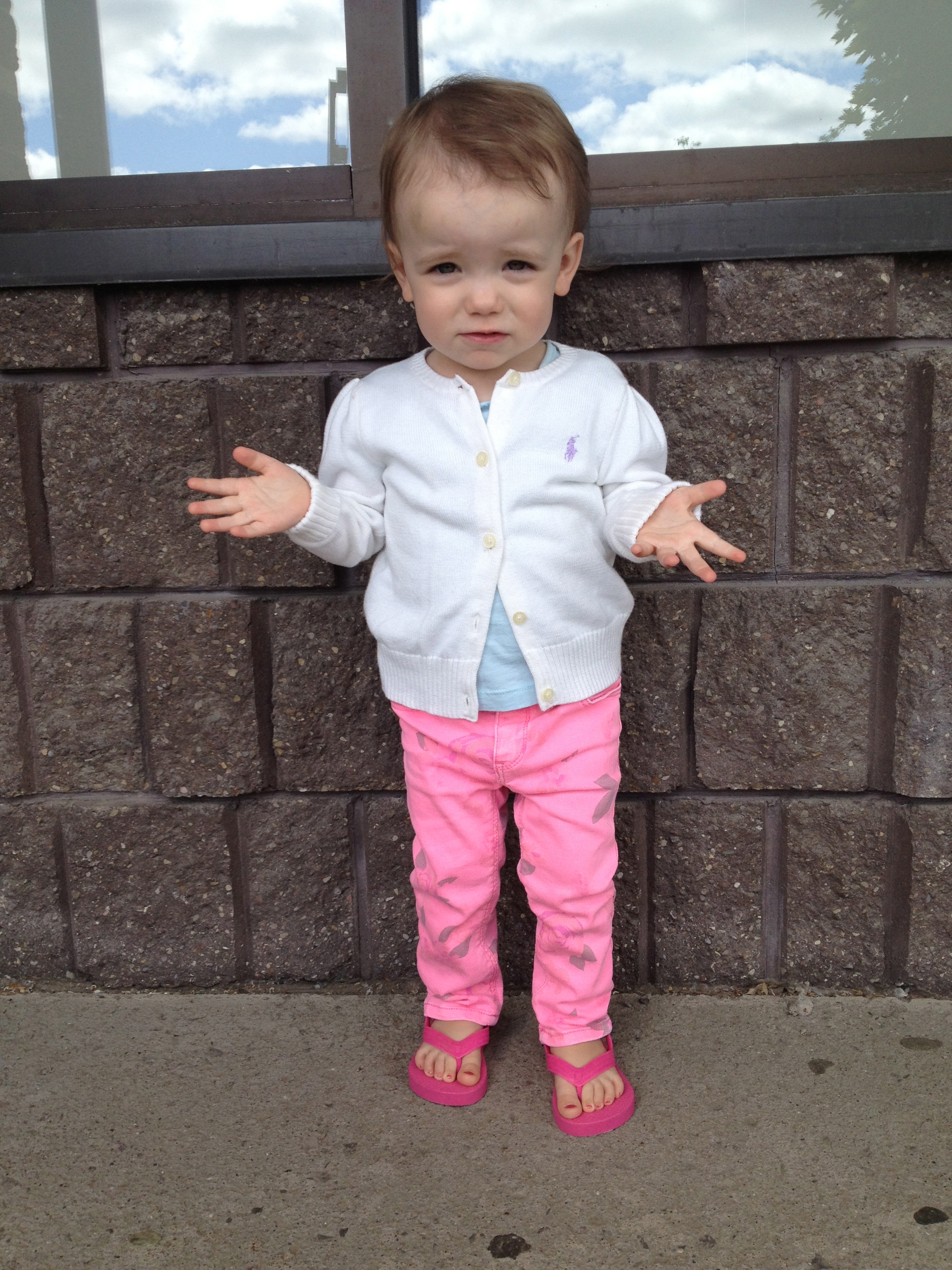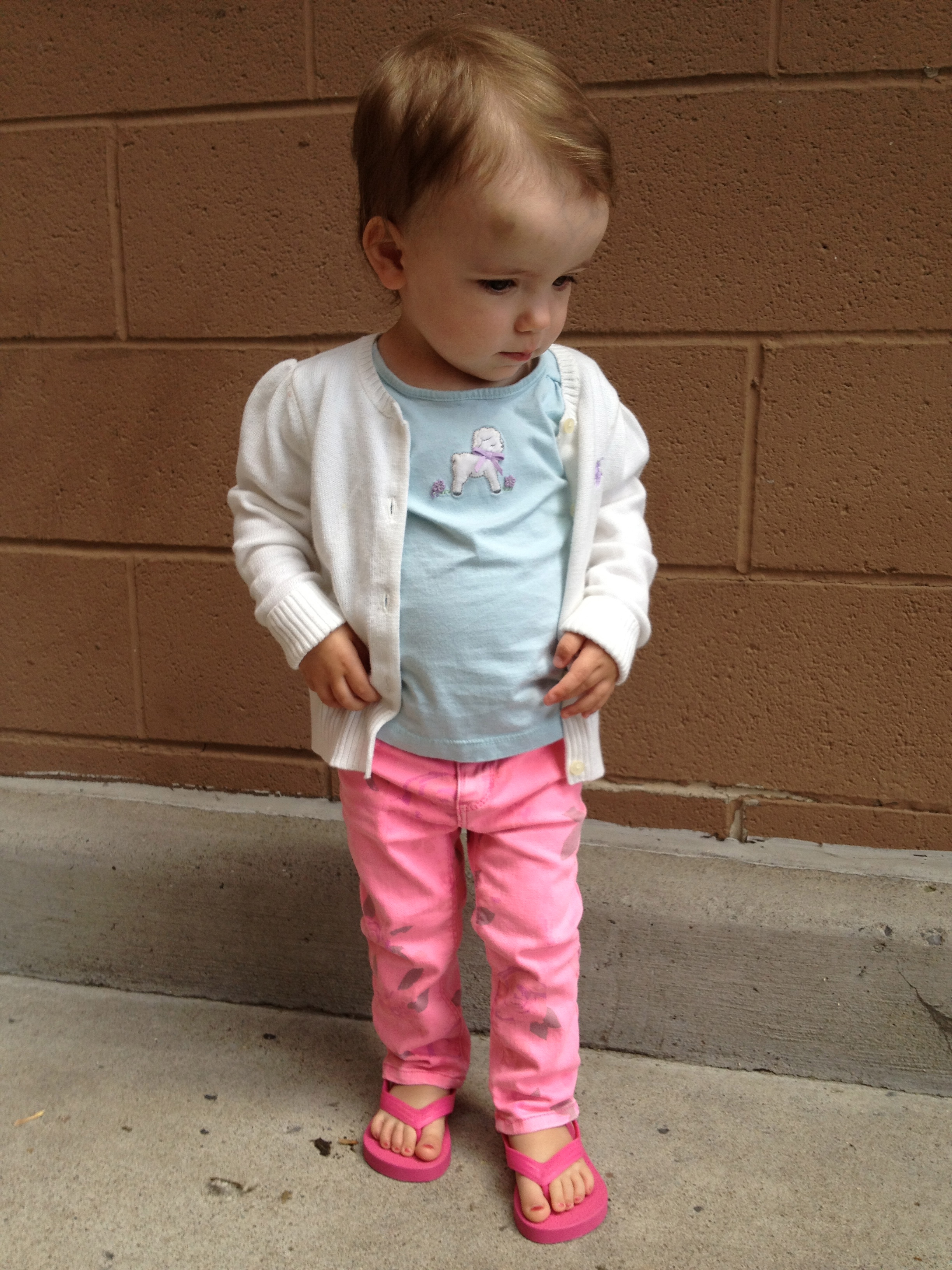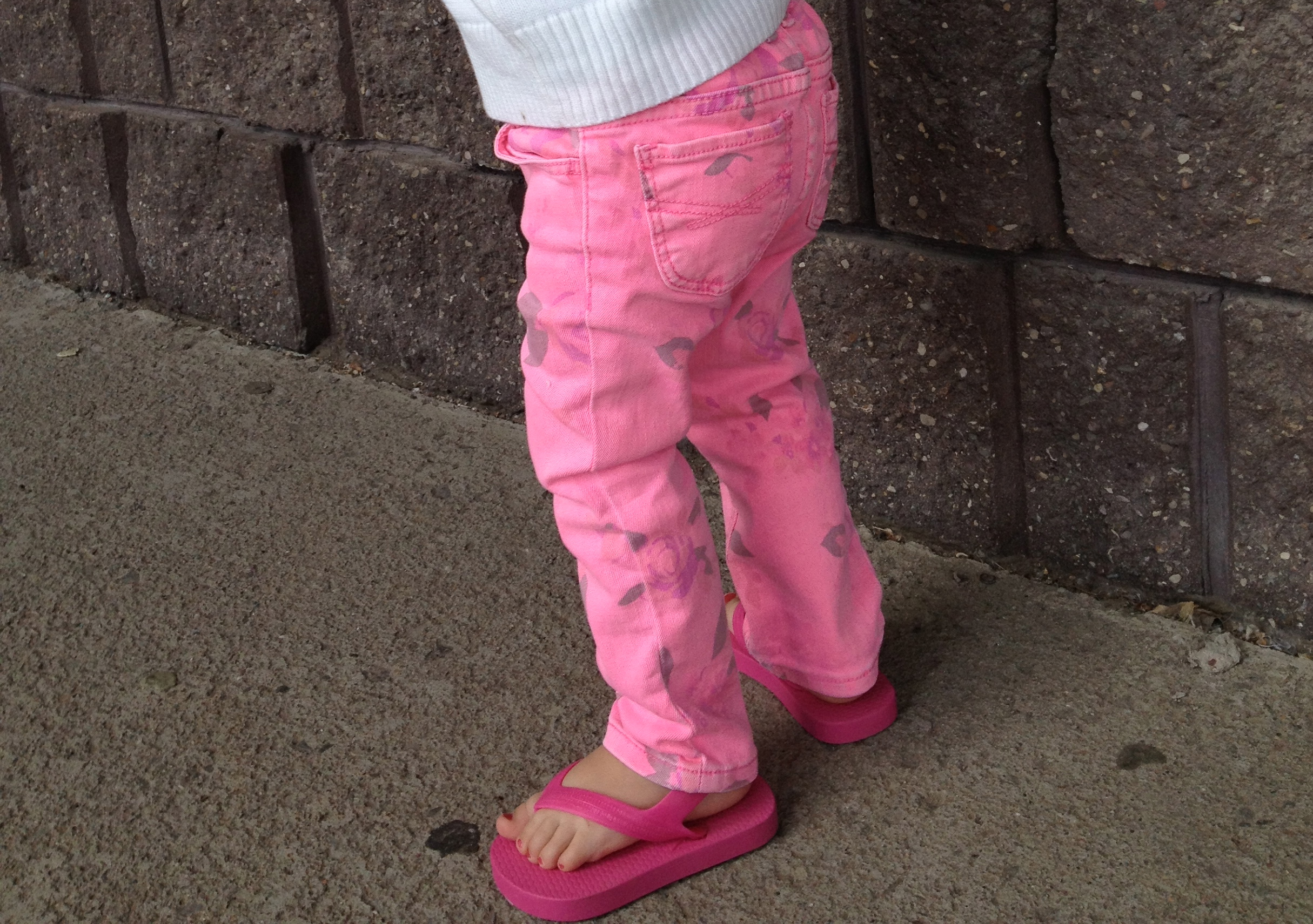 I’m totally in love with floral print pants for toddler’s. They seem to be a go to piece for Reagan these past few weeks as this Rochester weather figures itself out. Jeans weather is my ultimate favorite. I love a comfy pair of jeans paired with a t-shirt, a light sweater and sandals. (The lovely bruise is a result of a deck spill at Ev’s house… this poor girls head sure does always hit the ground first…97 percentile or greater…boom!)