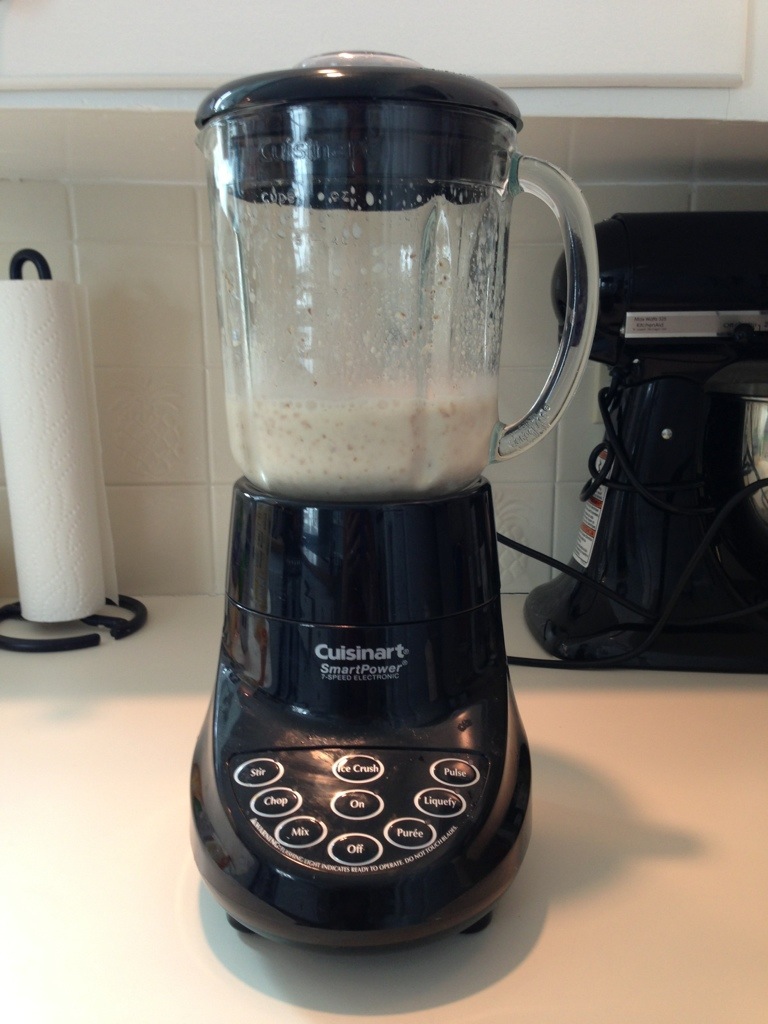Place all ingredients in a blender and pulse and blend. It tasted amazing and was a surprisingly filling way to start the morning with my boys!!