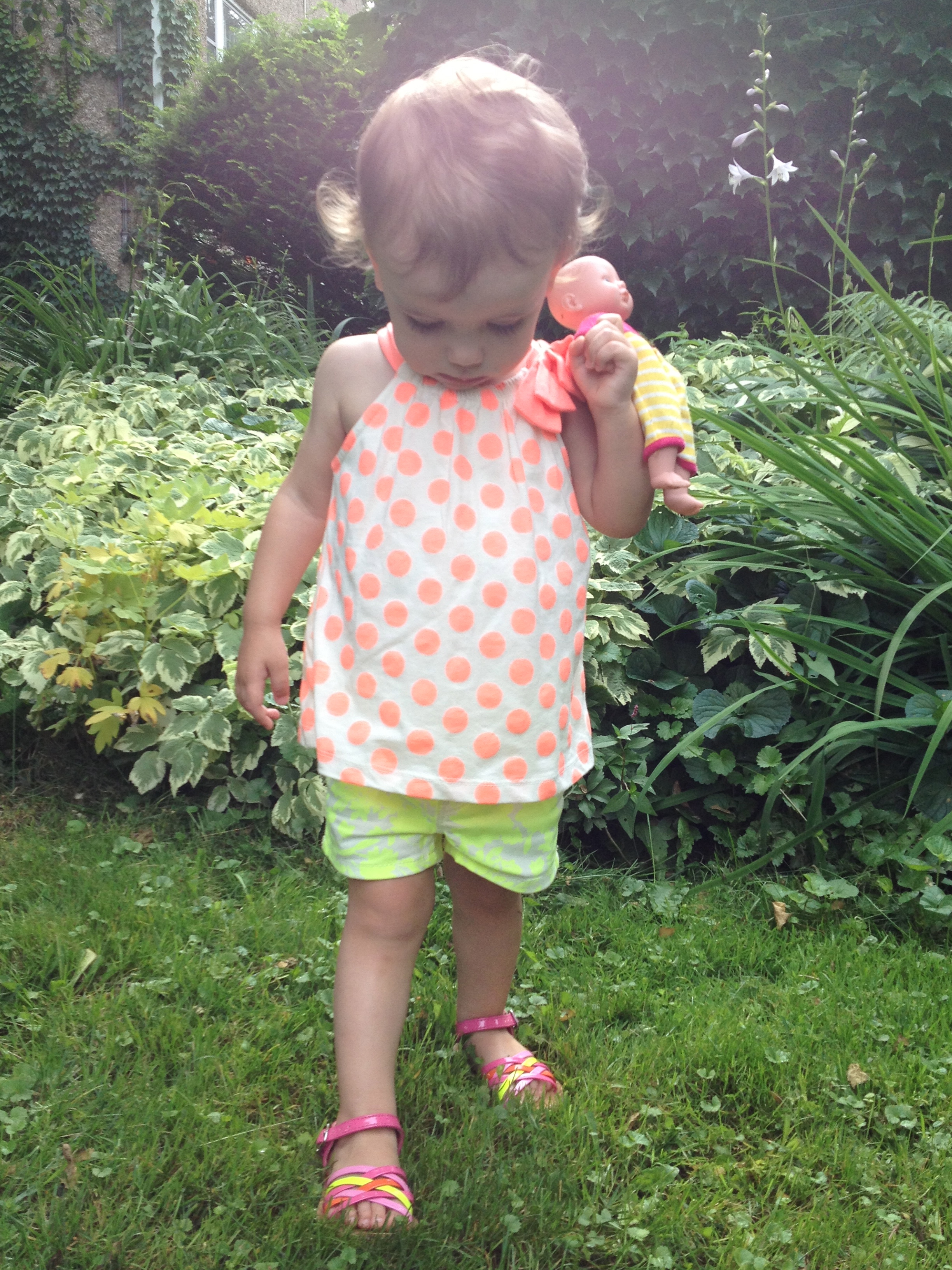 Enough about that and on to these super cute peach polka dots! This top is actually a onsie underneath, which is genius, because it keeps Reagan from taking her top off…which she has been doing lately and always in public- the library is her number one pick for her favorite place to remove her clothing- which isn’t the best place, because the librarians aren’t the friendliest and always look at me like I’m a horrible mother. Nevertheless, we continue to go each week and continue to get the same stares from the same women. You would think that they would just get over it already and find something else to negatively glare at.