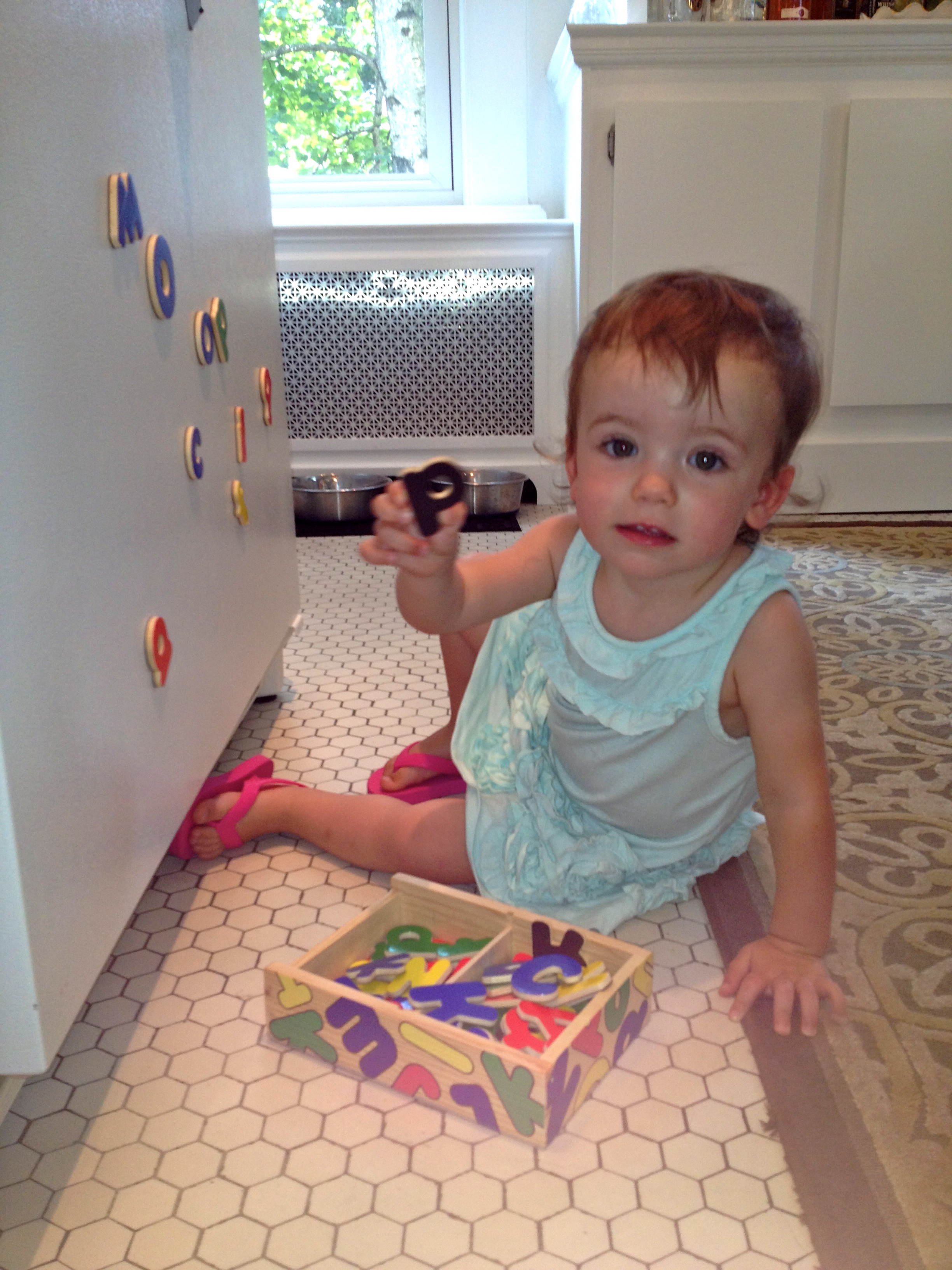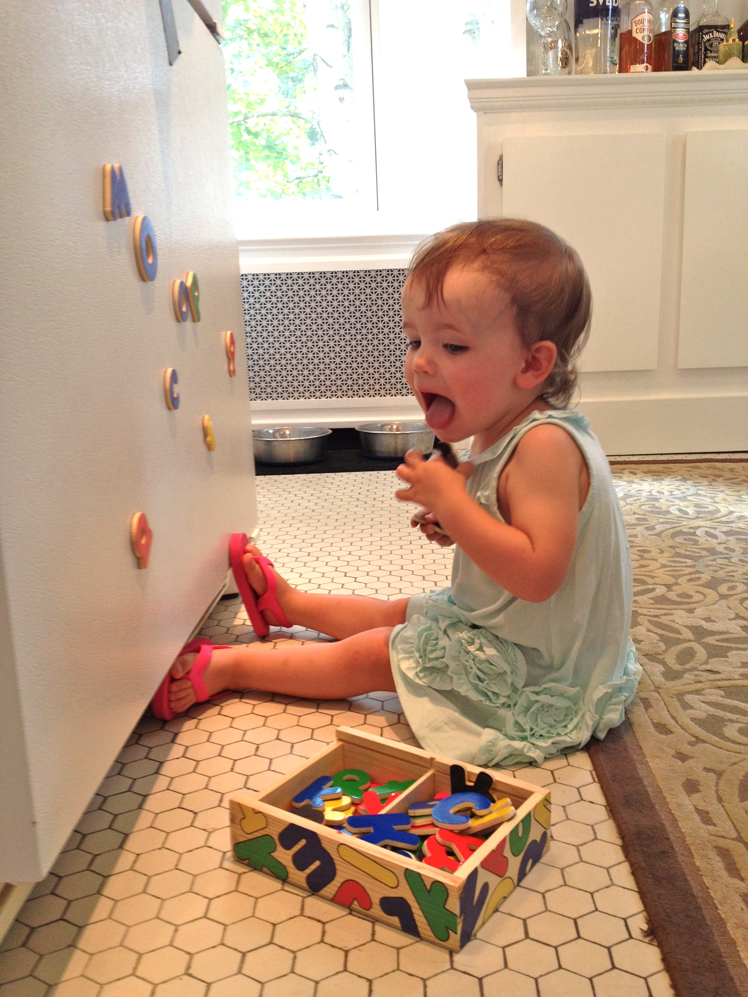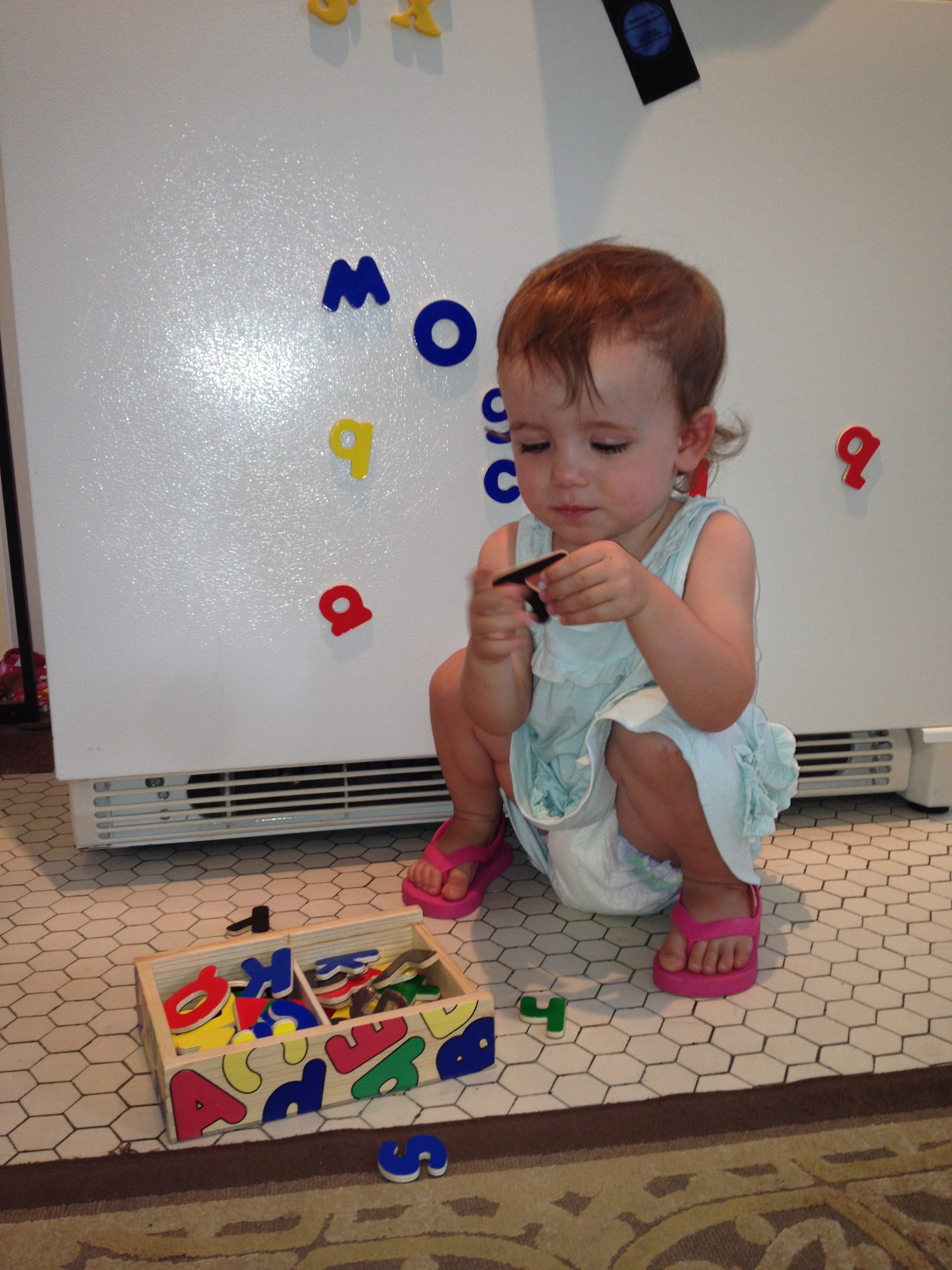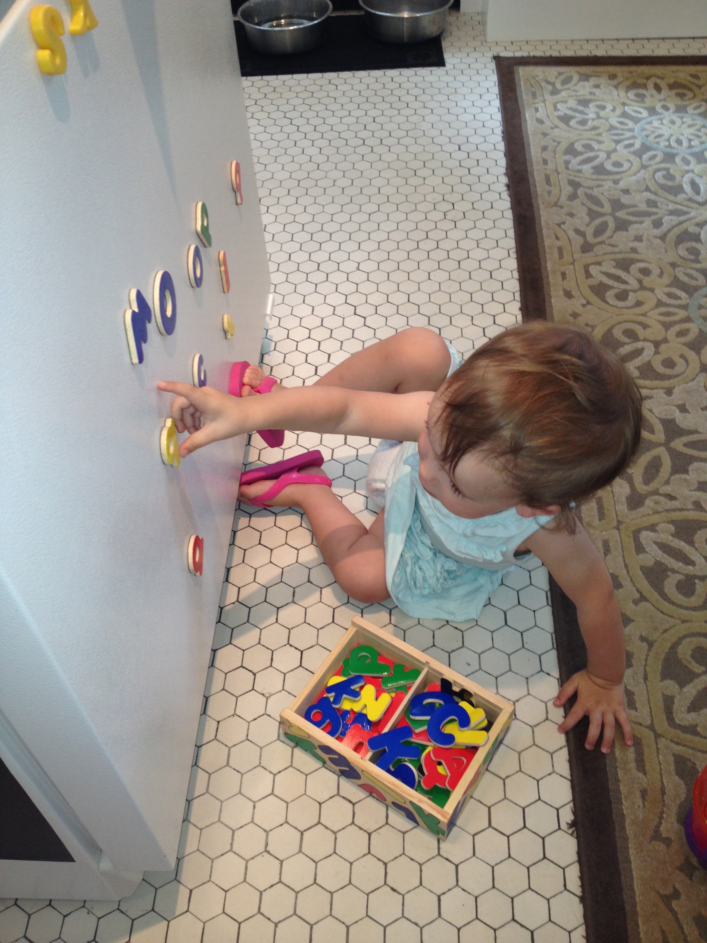 Upgrade! We purchased new magnetic fridge letters today and I couldn’t be happier! Fridge magnets keep Reagan busy for a very small portion of dinner prep time, which is better than no time! We previously sported the plastic magnetic letters on our fridge, I think that they are probably a staple in most homes, seeing how they can be purchased at the Dollar Store or in the dollar section at Target. These magnets always made me a bit nervous with their tiny circular magnetic backing. However, I still allowed them on my fridge…probably not the best idea. Whenever Reagan sat down at the fridge to play with the magnets, I would tell her that we needed to buy new ones, but of course I was usually making dinner, so the idea never sat with me for very long. It wasn’t until Reagan started to remove the magnets from the fridge, put them into her purse (an old Vera Bradley of mine that she has fallen in love with) , and carry them around the house and into the car with her that I knew it was definitely time to get rid of them. This activity, of traveling around with the magnets, threw up huge DANGER signs for me. I was afraid that with her out of sight, one of those little magnets was sure to find it’s way into her mouth. Which in all actuality, could happen just as easily with me in the same room…such a stupid mom moment. Into the garbage the plastic letters went!