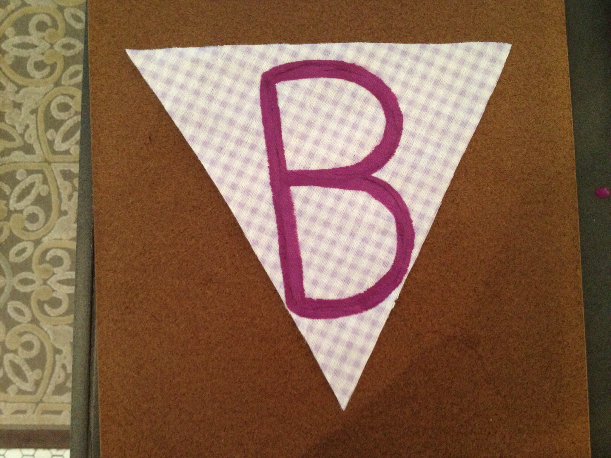 Using a piece of paper, measure out the size of the flag that you want. My flags had 8 inch sides. Draw the flag on the piece of paper and then cut it out so that you have a pattern to trace on your chosen fabric. I wrote the letter ‘B’ in my cut out pattern to make sure that the size of the letters that I wanted fit inside my flag.