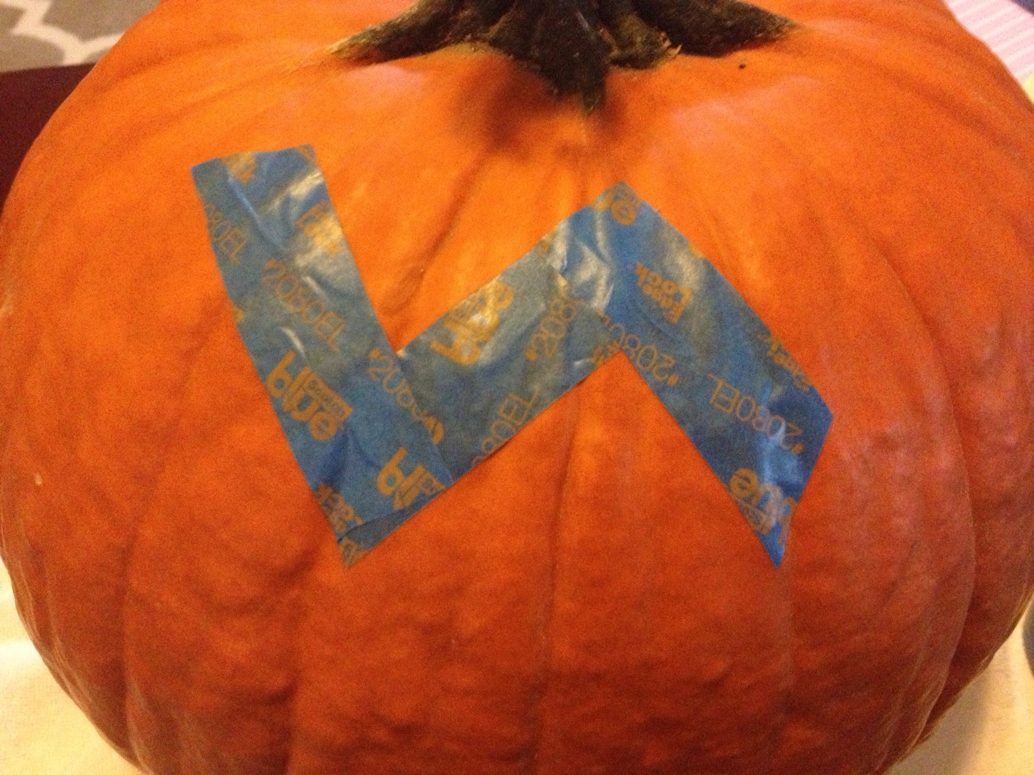 Follow top pattern an inch or two ( eye balled) bellow the top pattern. Cut pieces of painters tape and continue until your pattern covers the pumpkin.