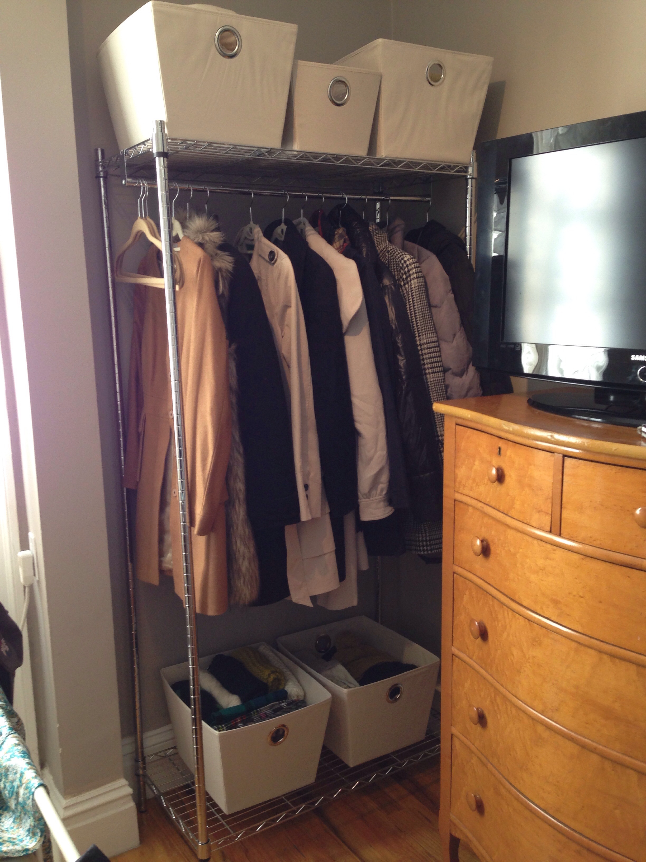 I did my research and found a garment rack that had two shelves to provide even more storage, in an apartment you can never seem to find enough. After fighting through the Saturday Bed Bath & Beyond crowds, I had the rack assembled in less than half an hour. The rack fits perfectly in the previously wasted corner and provides us with winter organization for coats, hats and gloves (in the lower baskets) as well as a better system for sheets and extra linens (in the upper baskets). I used the same baskets in my jewelry closet. The open layout allows easy access and hopefully will help the coat dumping problem at the table.