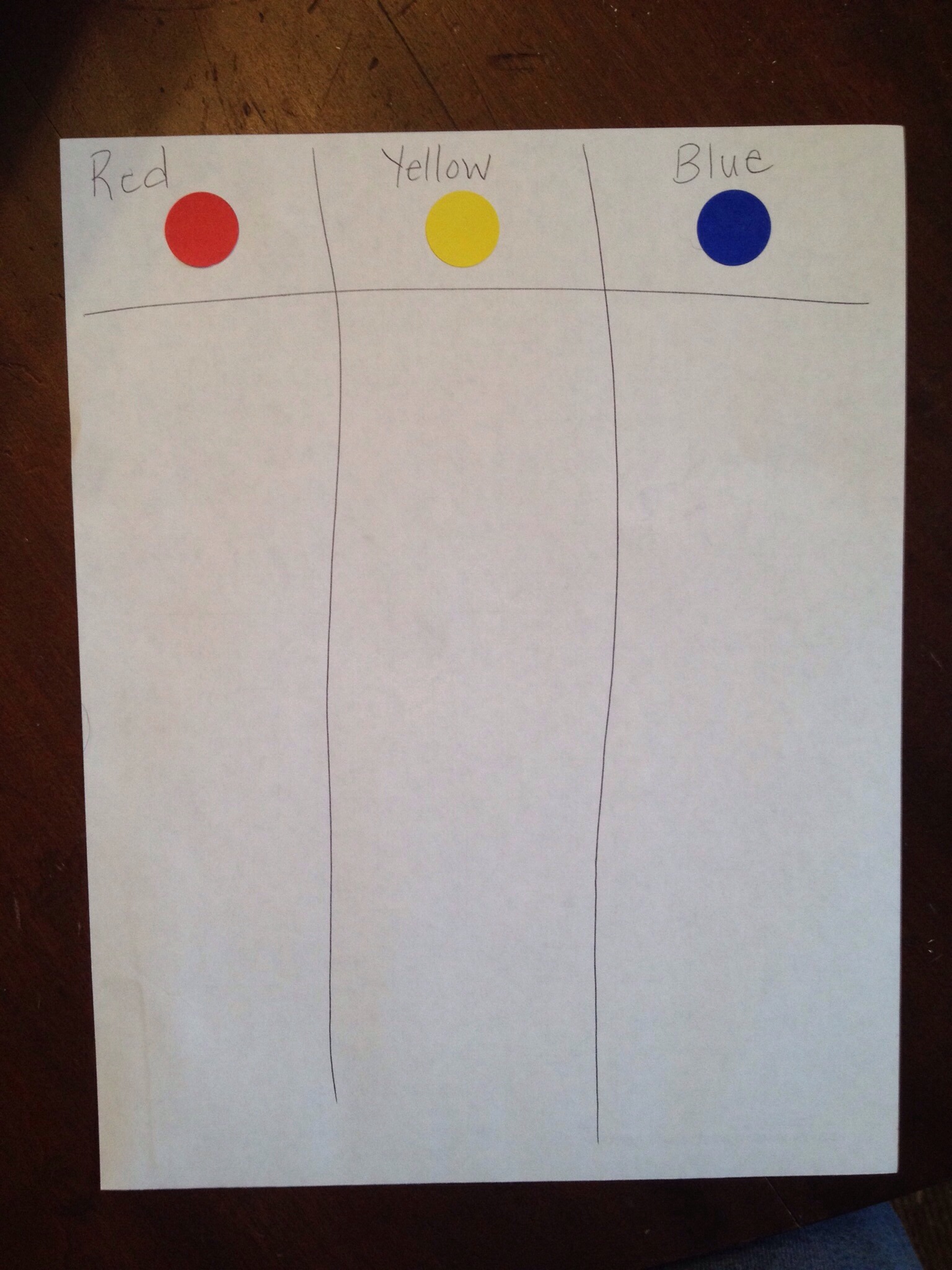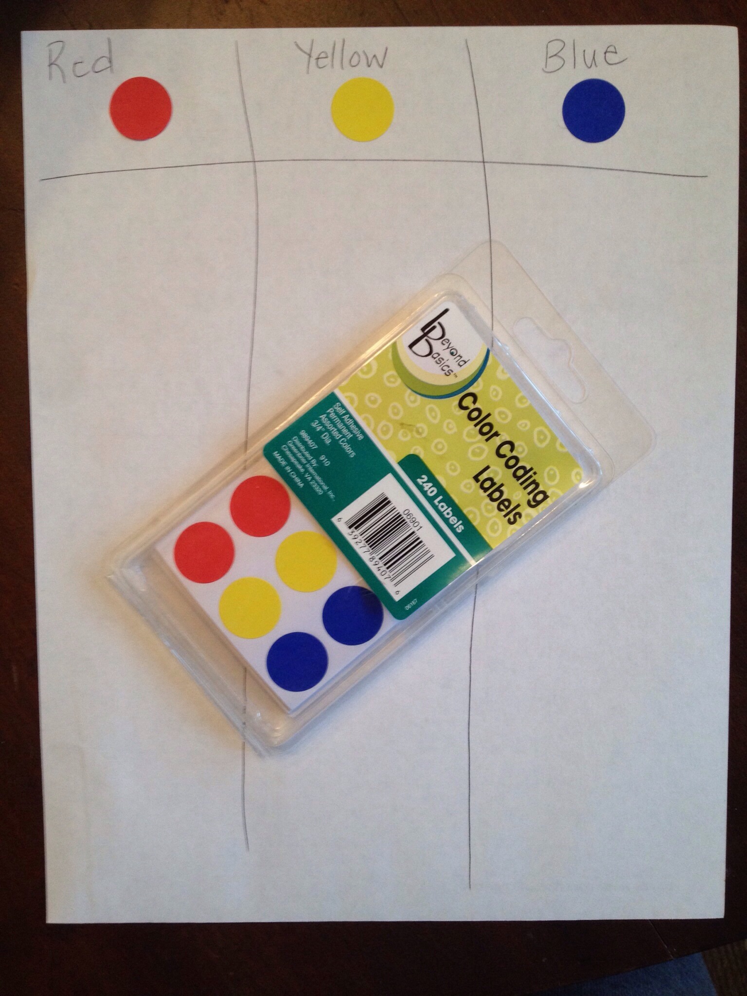 Create and label three separate categories. Add a corresponding color dot to each named category. While pointing to each color, verbally say the name of the color to your child.