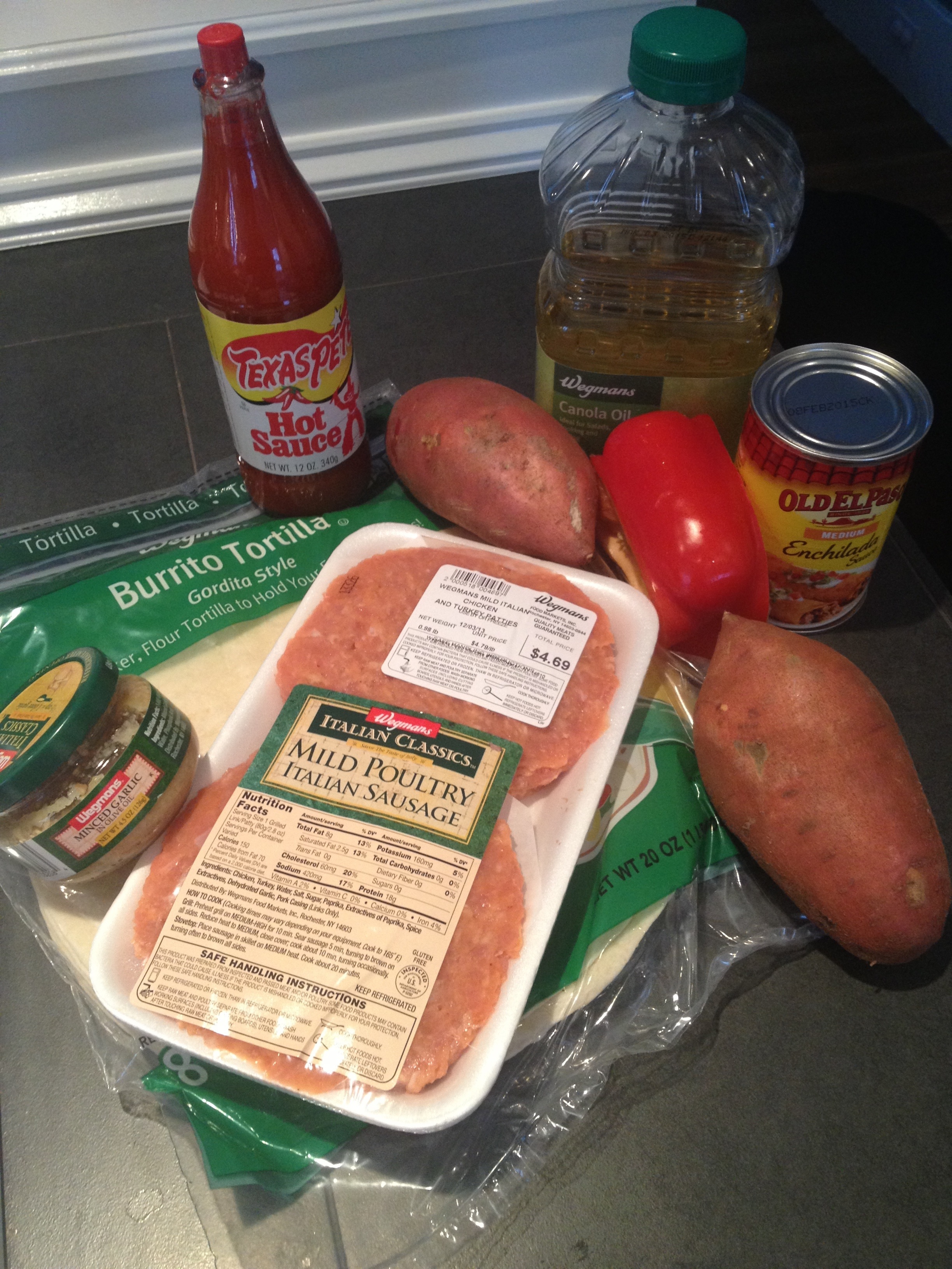 I adapted Budget Bytes Sweet Potato and Chorizo Enchiladas, which are amazingly delicious, to accommodate what I had on hand in my kitchen.