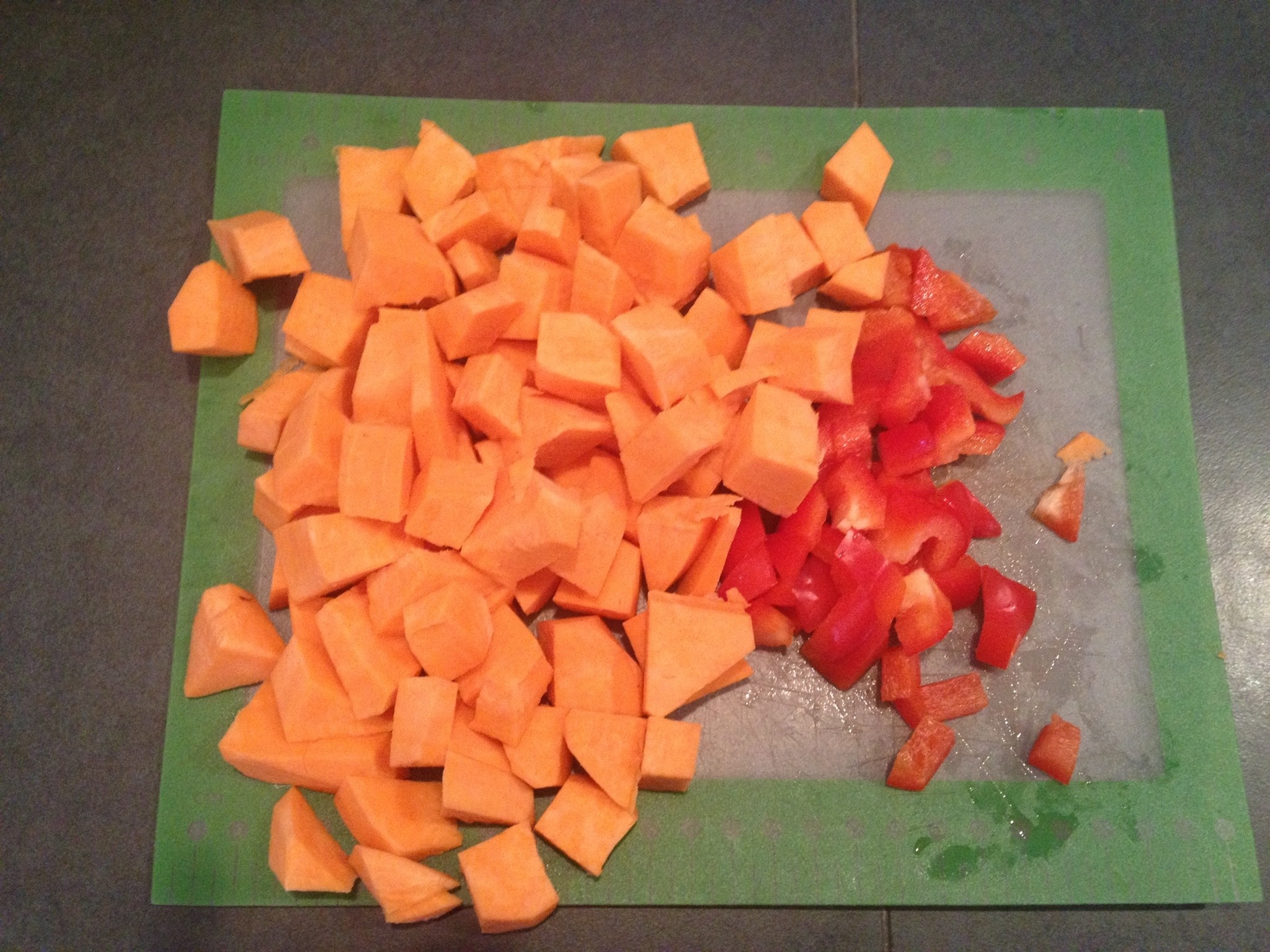 Peel the sweet potato and cut into a half inch cubes. Remove the stem and seeds from the pepper and also dice into half inch pieces.