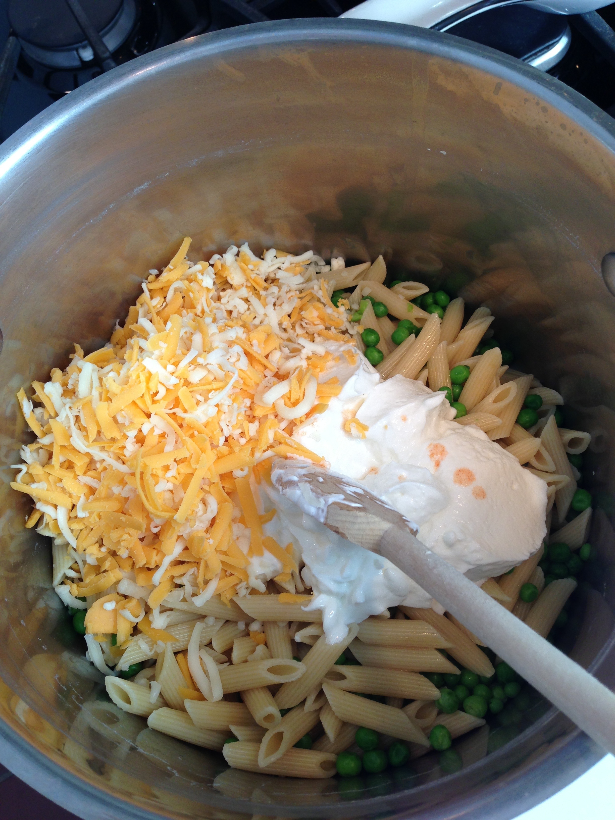 5. Return pasta and peas to pot and add in 1/3 cup of pasta water, yogurt, a few splashes of Tabasco and half of the cheese. Stir until cheese is melted.
