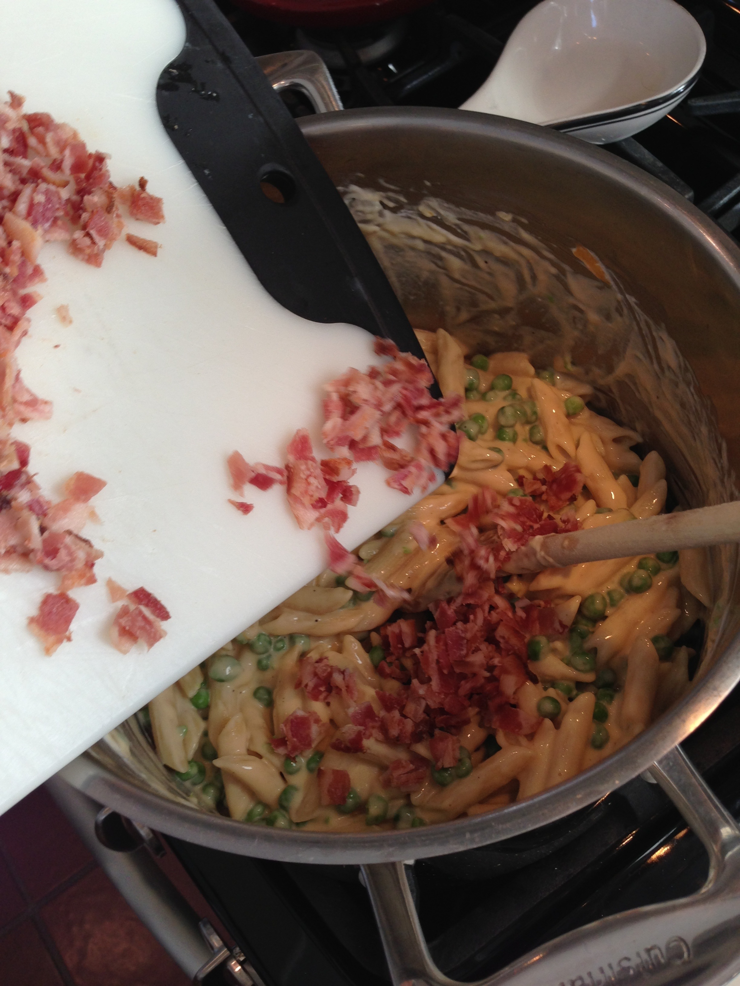 3. While pasta is cooking, cut bacon into small pieces and shred cheeses.