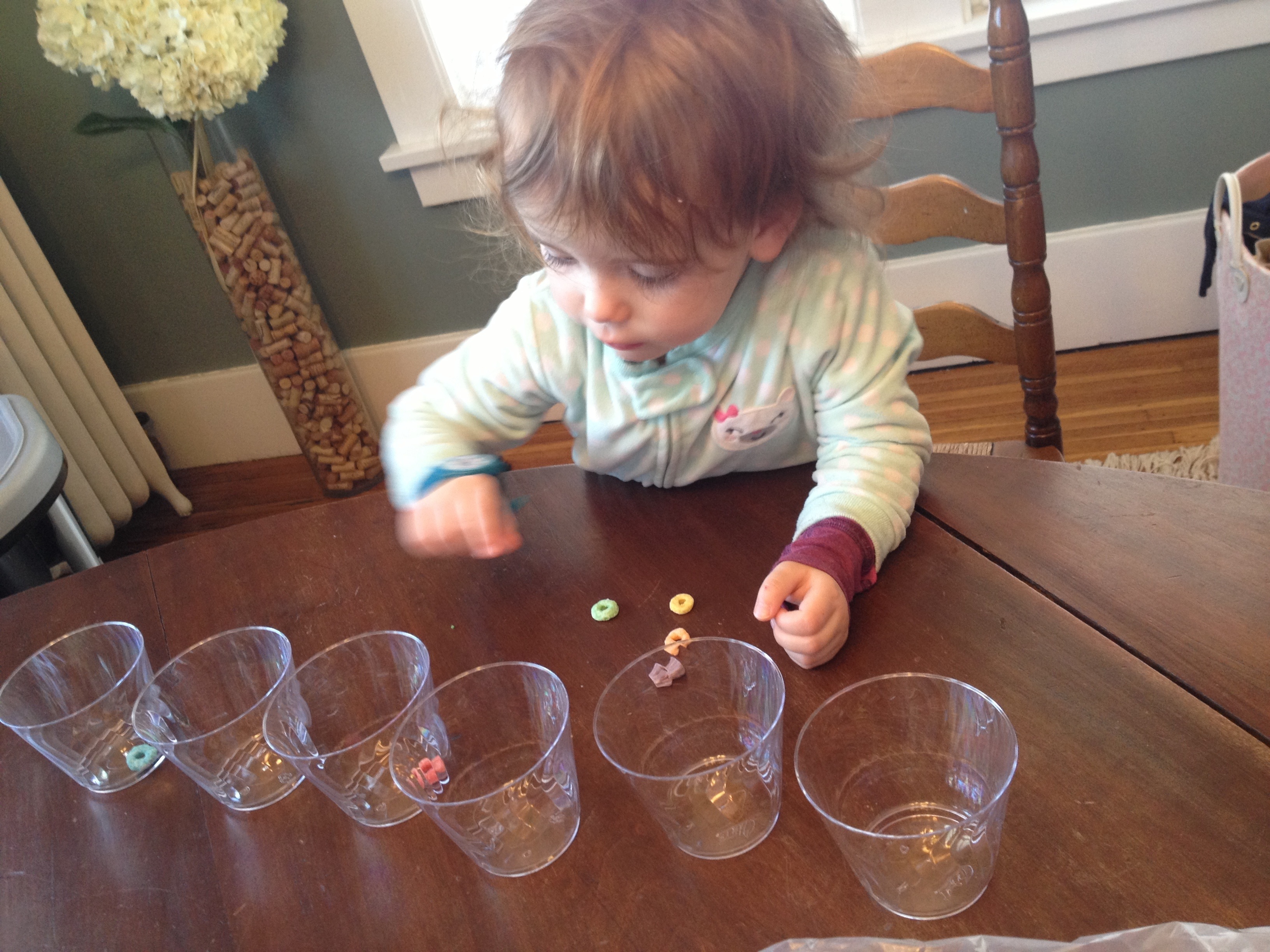 Place a handful of fruit loops in front of your child and have them sort the loops into corresponding cups.