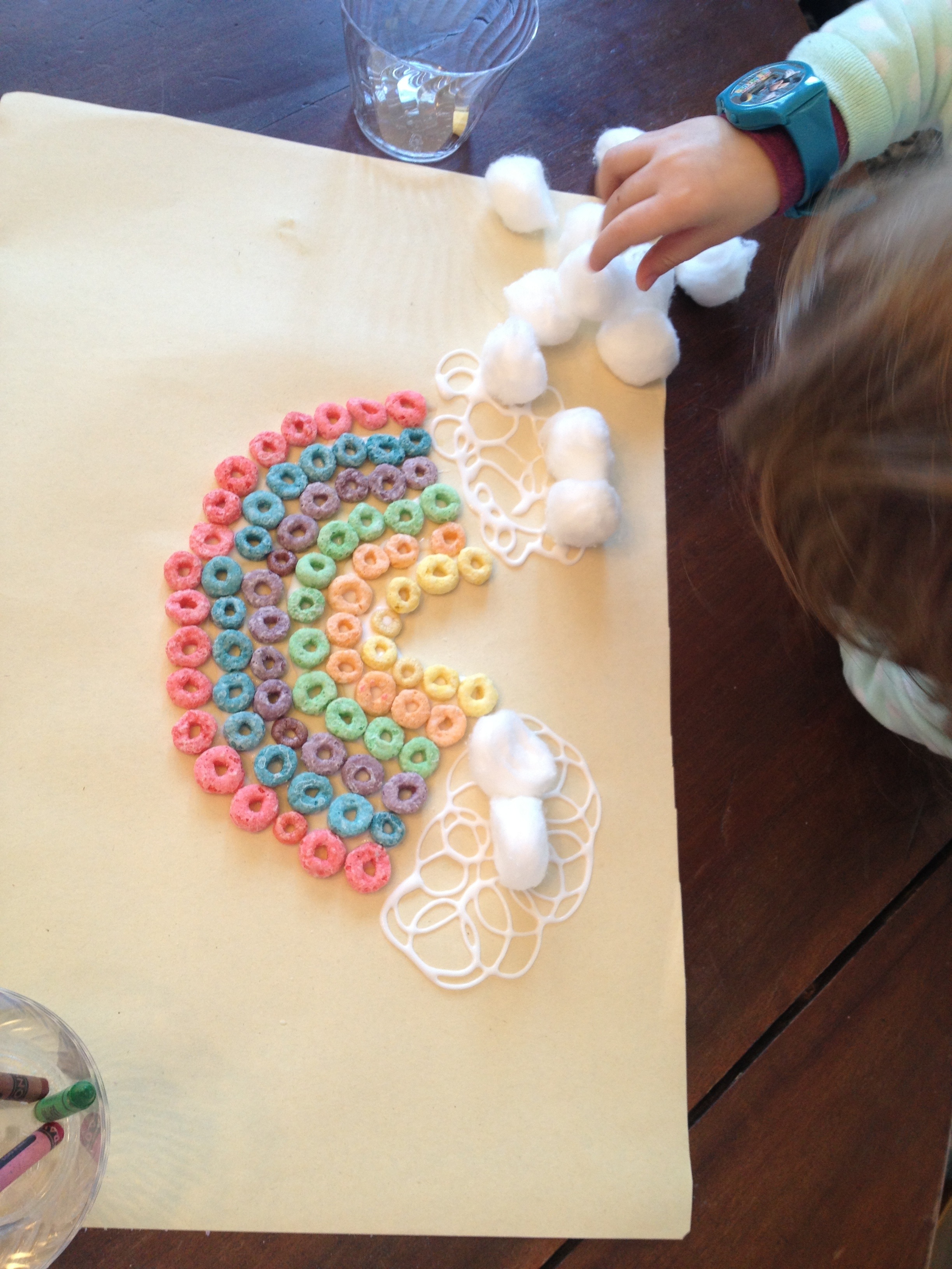 Draw an arch with the glue. Allow your child to choose the color that they would like to use first. Model how to place the fruit loops onto the glue. After the first arch color is done, continue underneath until all colors are used.