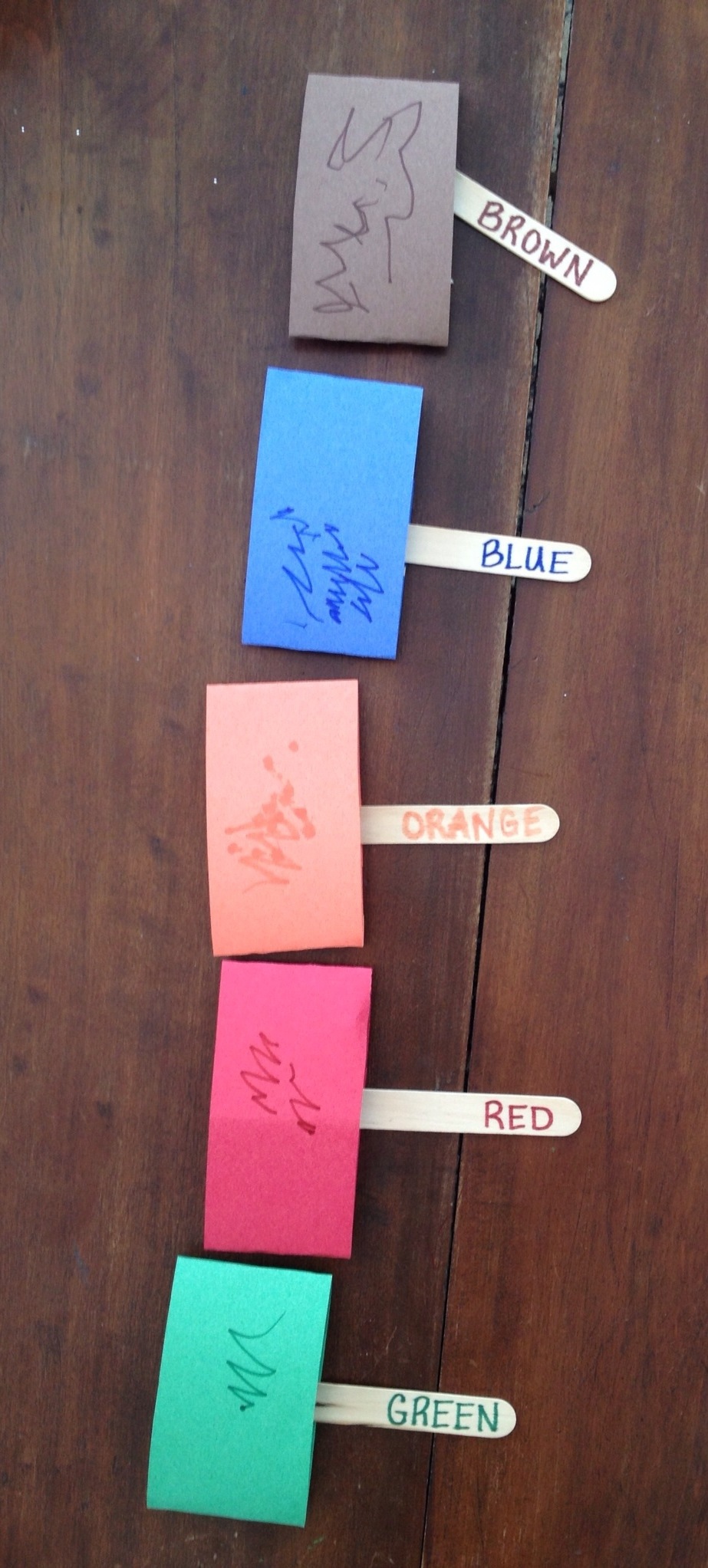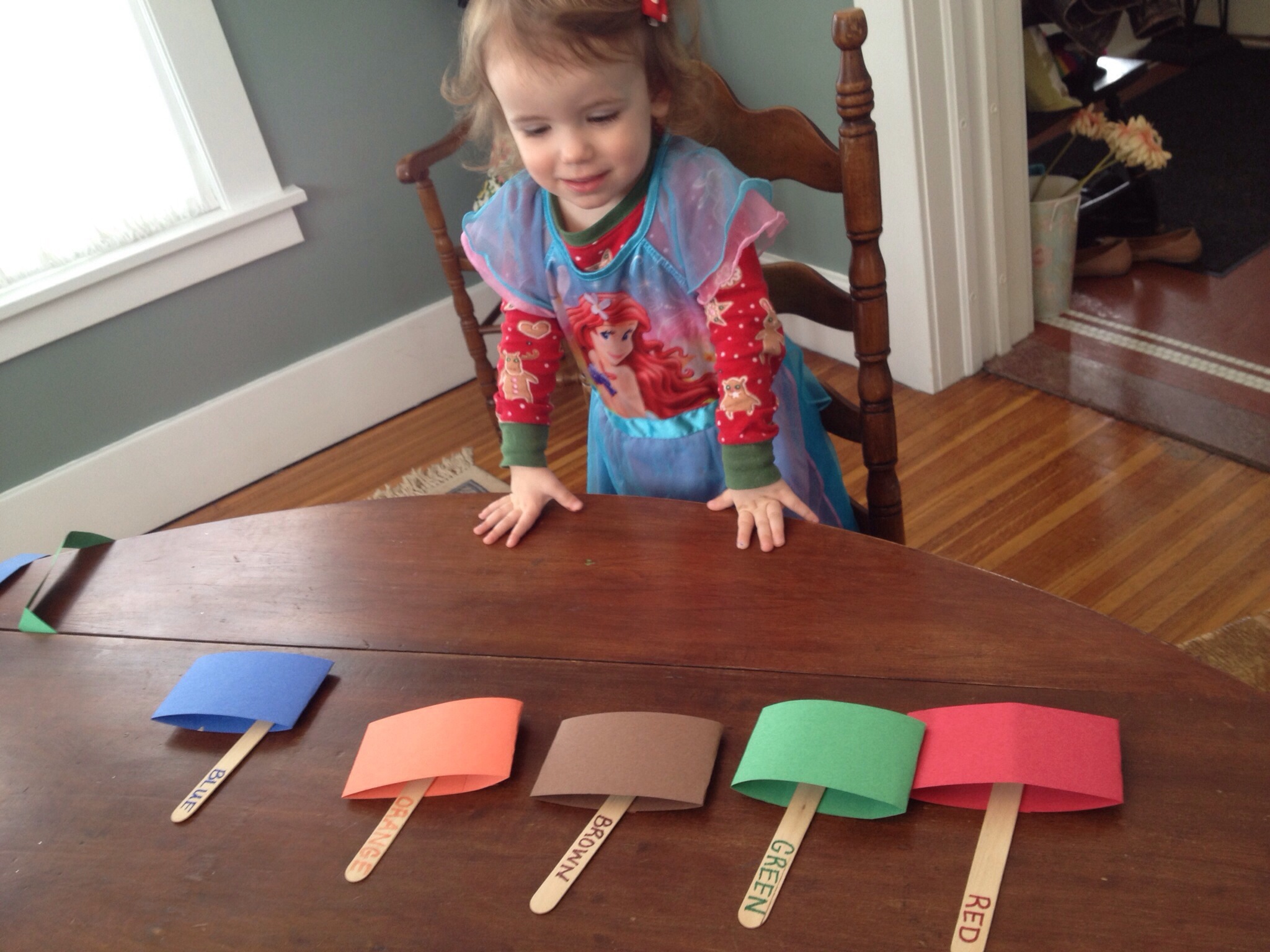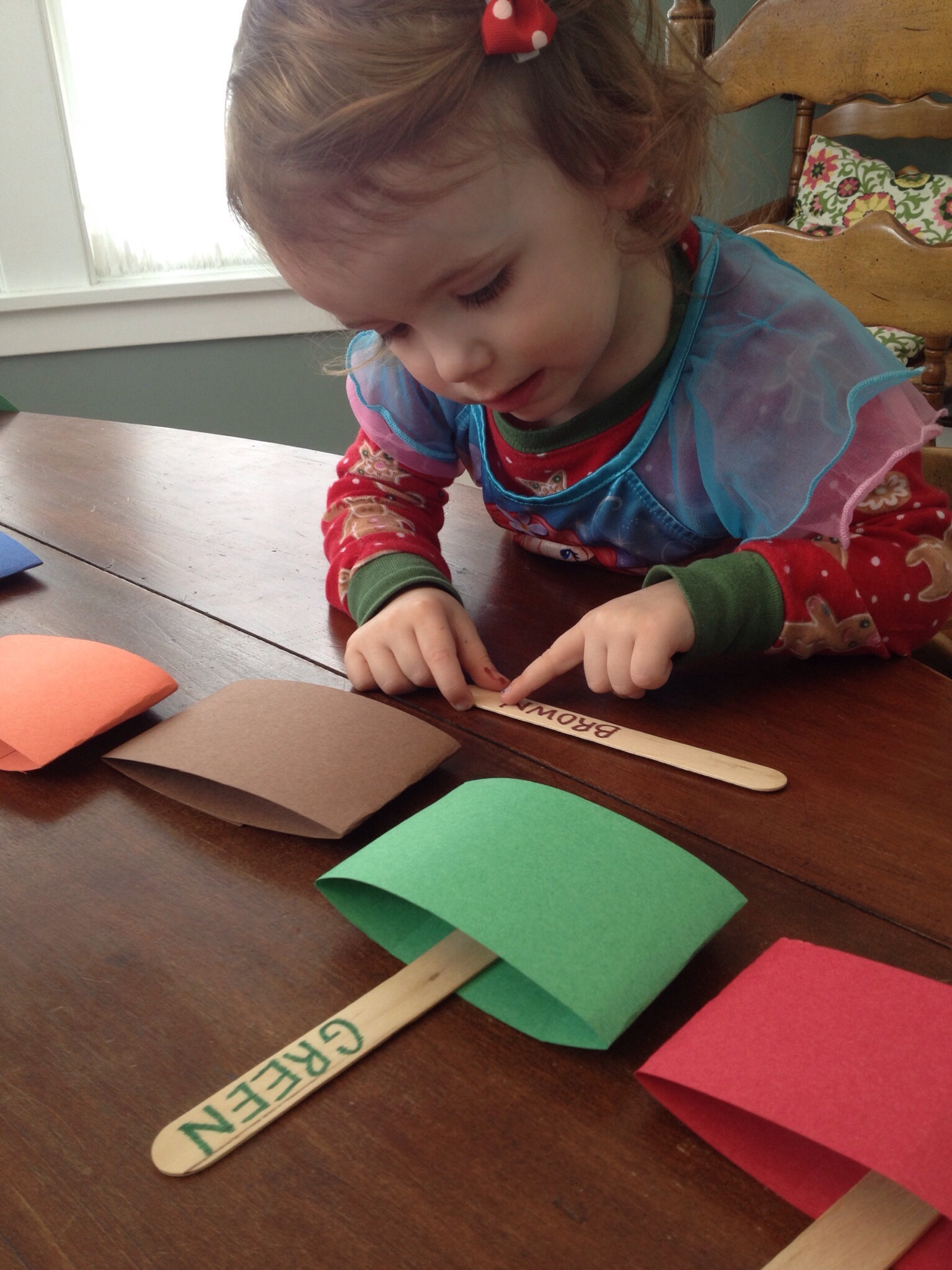 Write the name of each colored sheet of paper, in large letters, with corresponding colors, on the end of each popsicle stick. Have your child assist with this by asking them the color of the sheet of paper and then allowing for them to listen to you sound out the color name as they guess which letters come next.