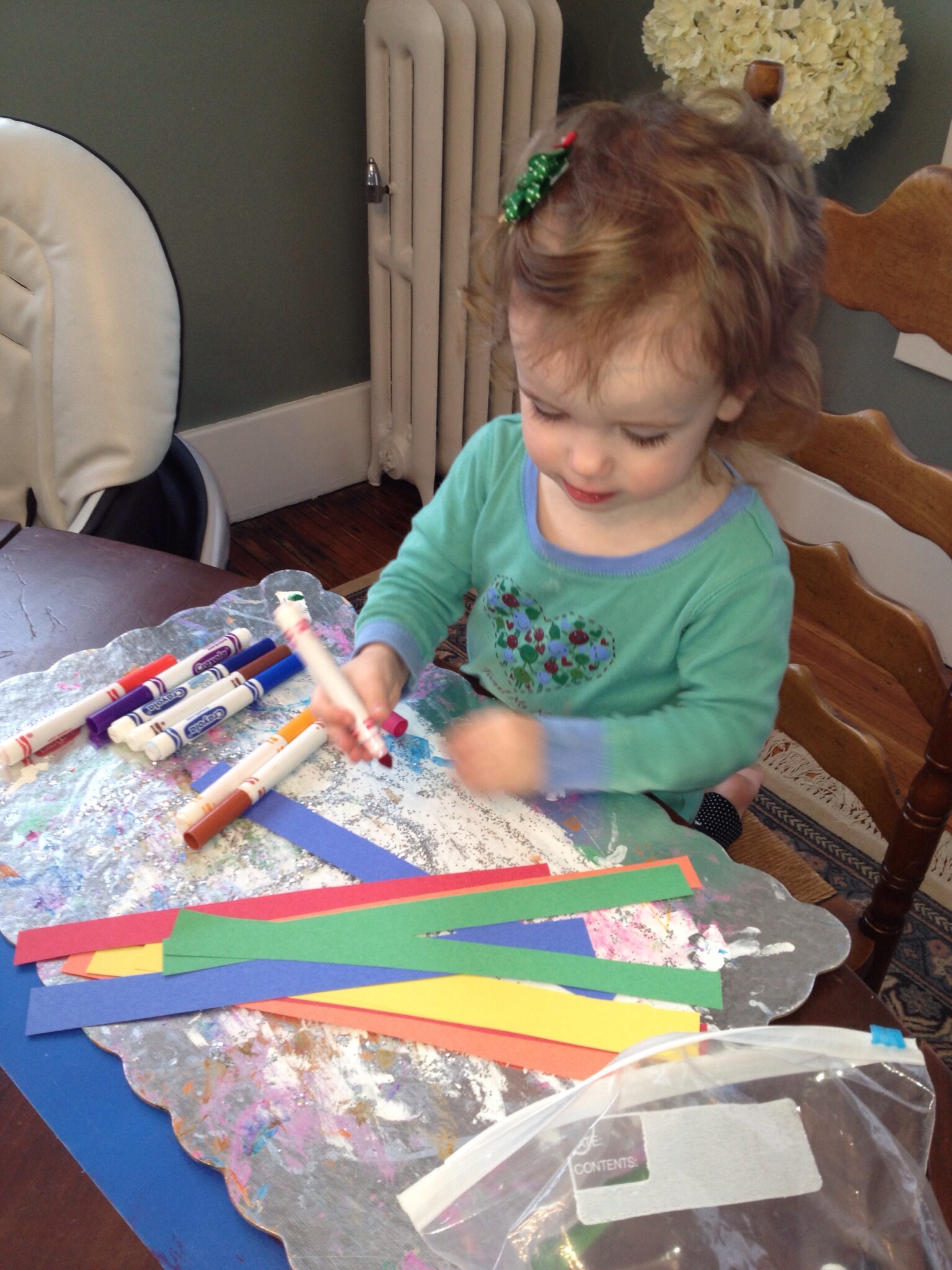 Cut several strips of paper- I eyeballed while cutting- ours were not much smaller than an inch wide. Cut the paper the long way and keep the length to the strips. Reagan decided to color the strips; such a great addition!