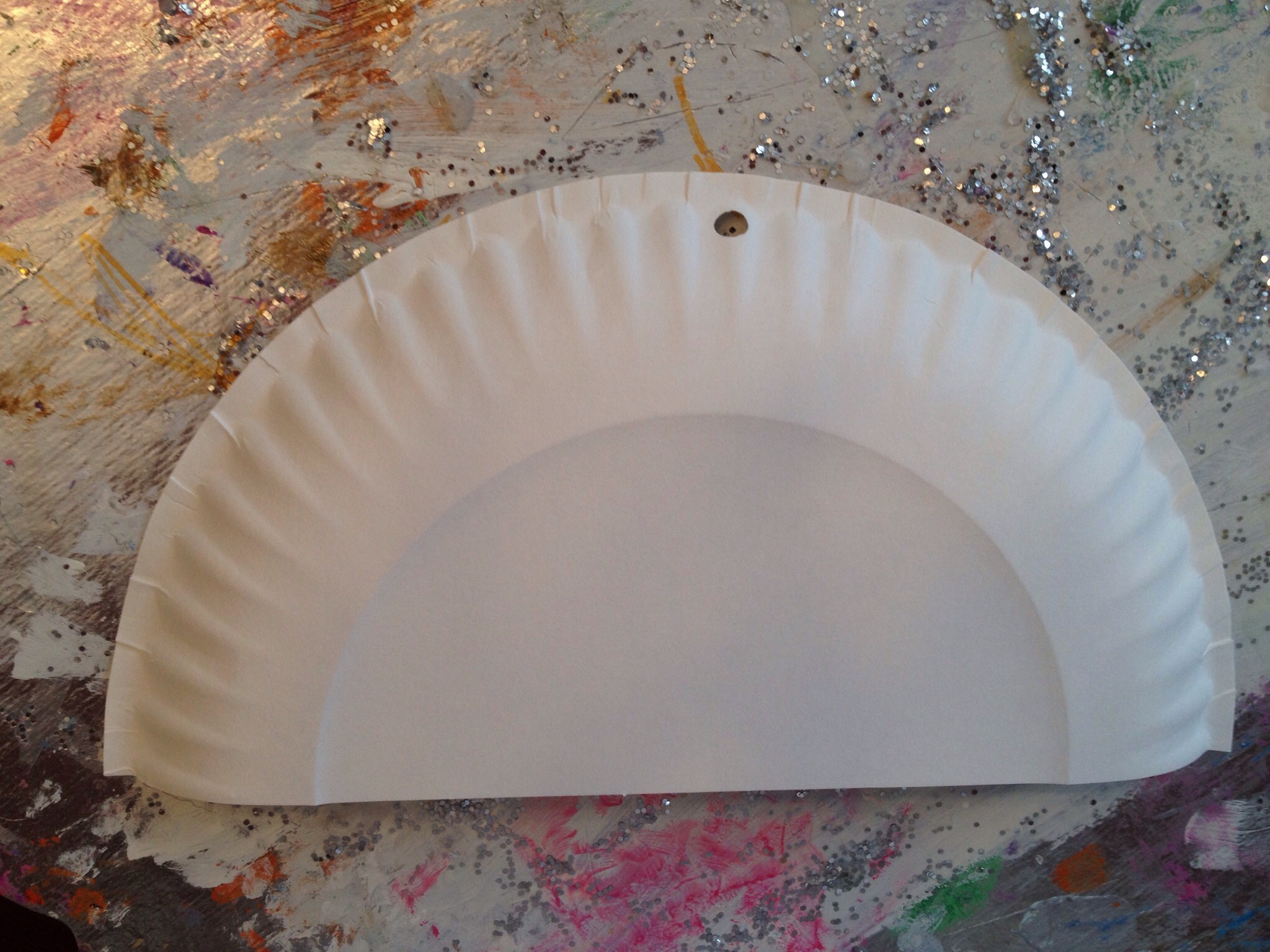 Cut the paper plate in half and punch a hole, in the plate, towards the top/center.