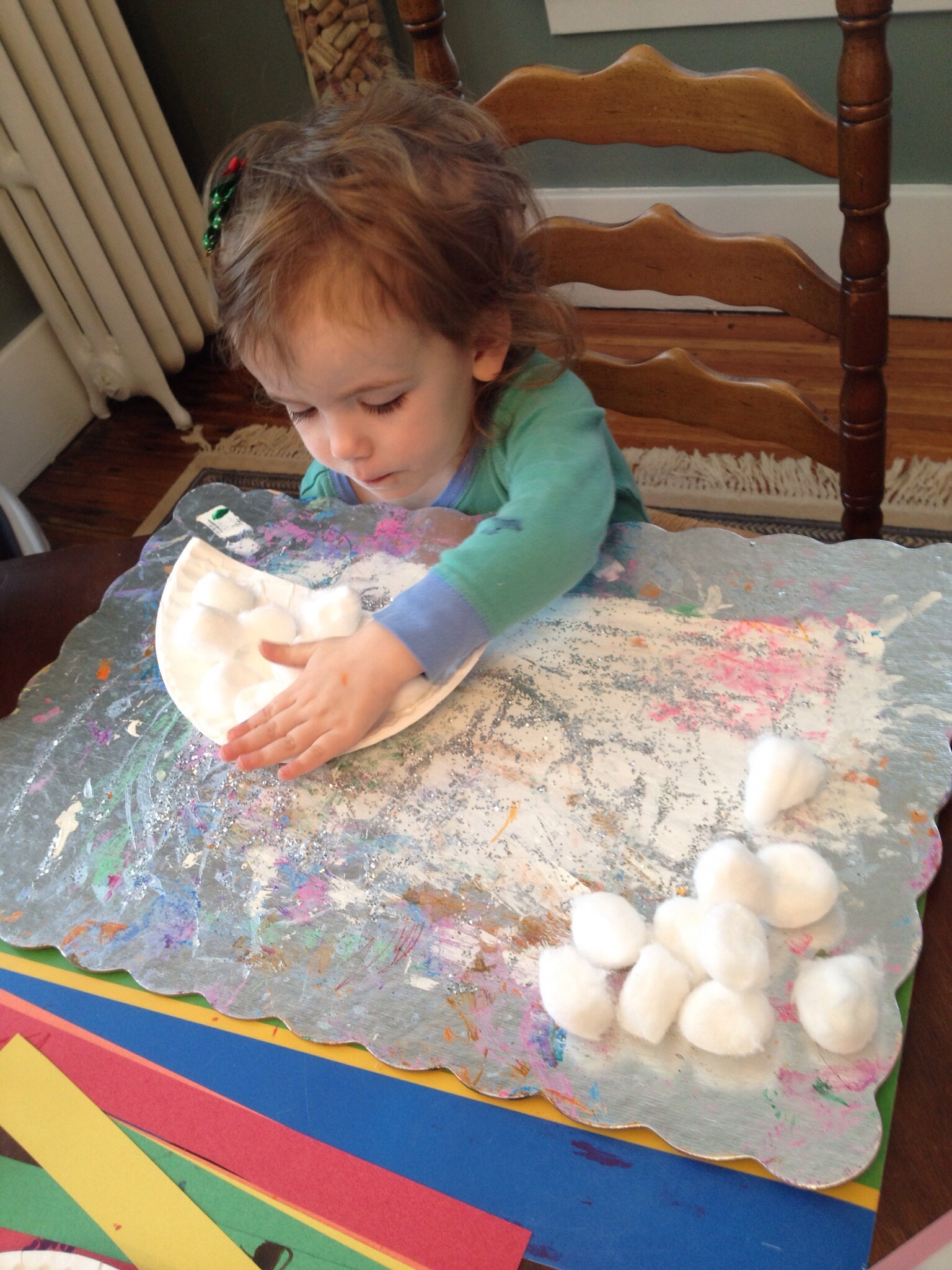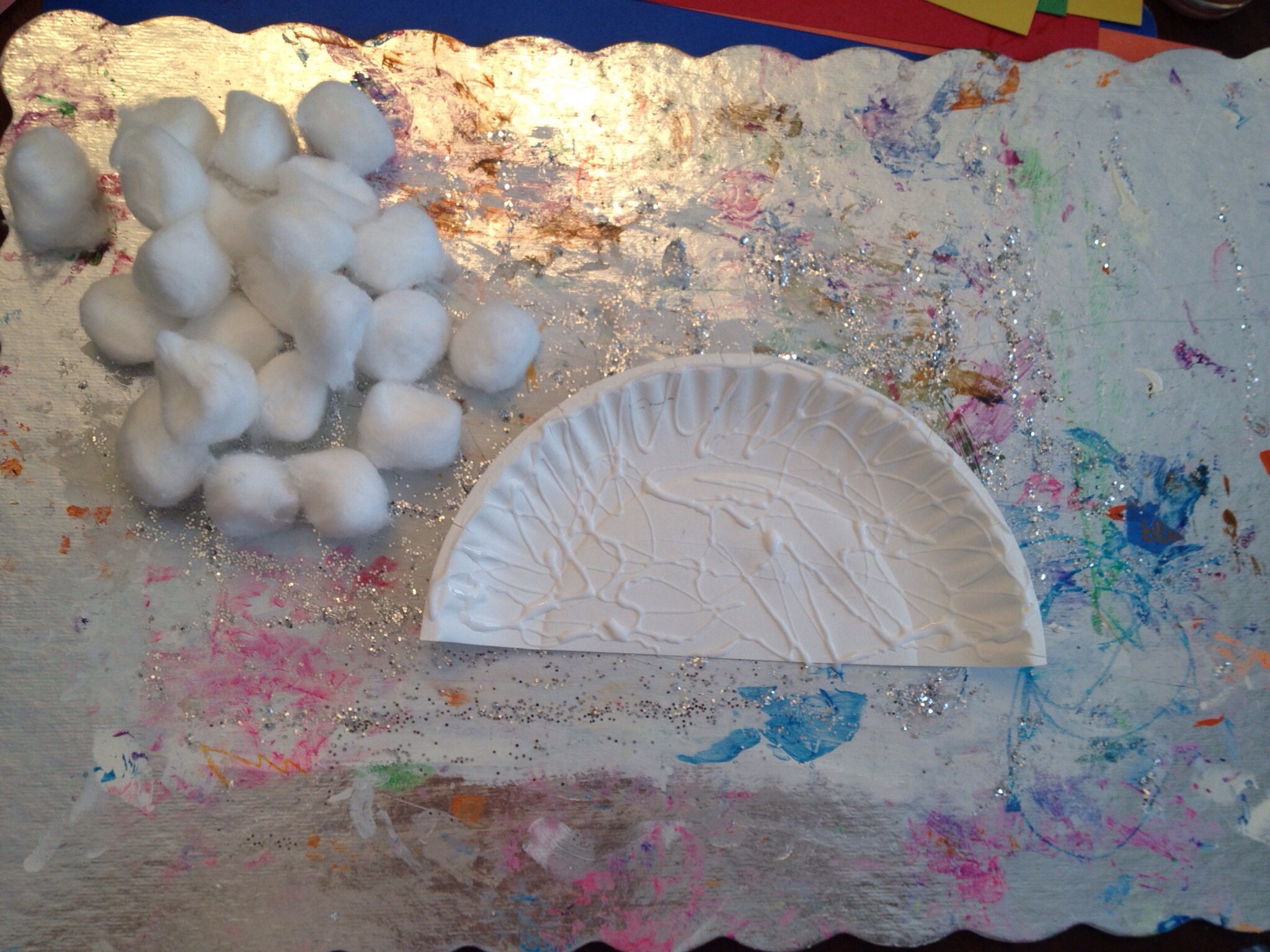 Swirl glue, covering plate. Cover plate with cotton balls, pressing firmly. Reagan and I talked about the shape of the cotton balls, the color, how they felt and what they were representing within our project.