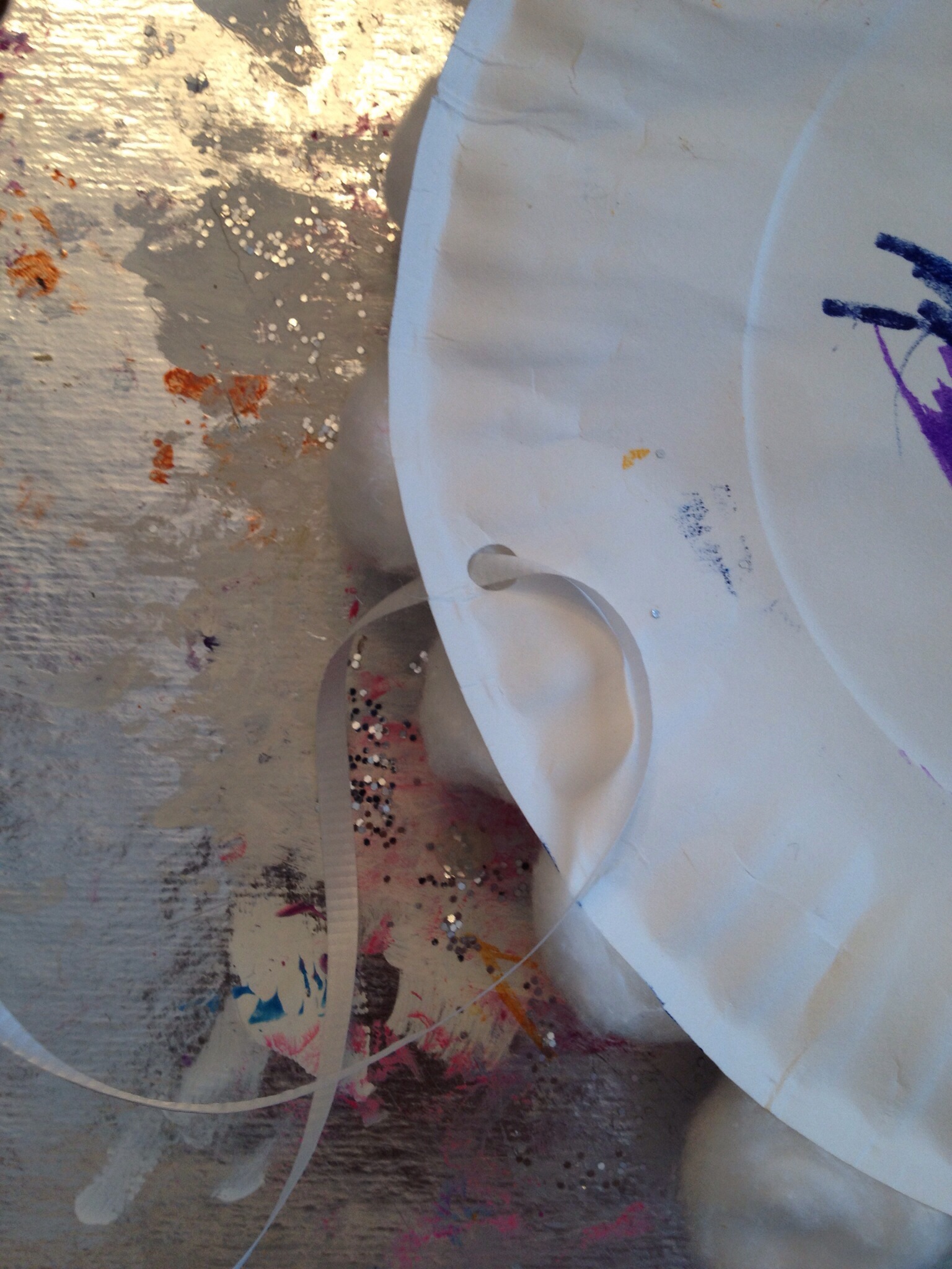 Squeeze a line of glue towards the cut edge of the paper plate. Reagan picked the order of the strips, lined them up and pressed firmly for them to stay. We talked about the colors and came up with various things that were the same color as our strips- i.e. Green- grass, yellow- sun flower, red-grandmas lipstick and so on. ( the strips are glued on the opposite side of the plate from where the cotton balls were glued)
