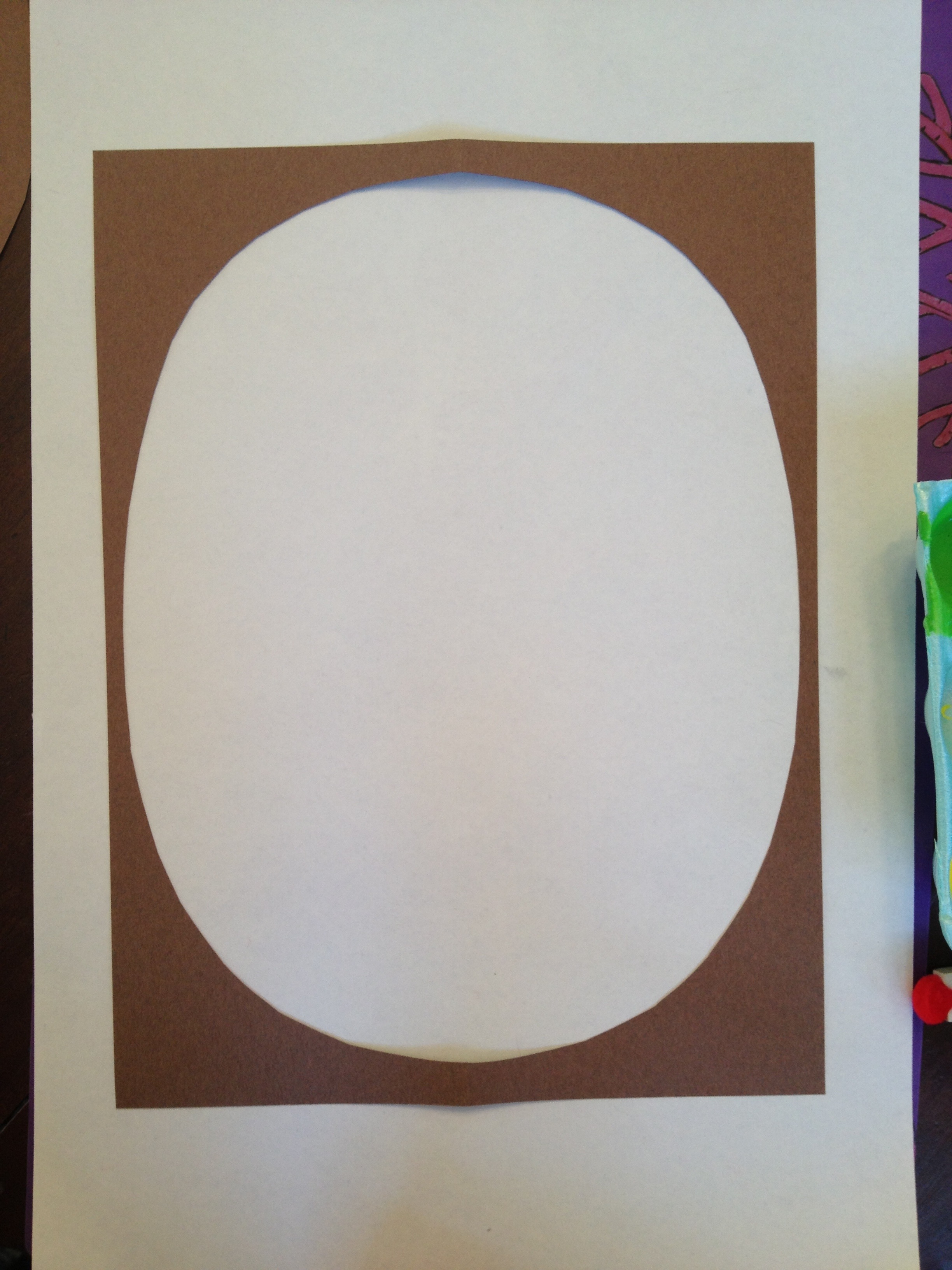 Fold a piece of construction paper in half and free hand cut out the shape of half an egg. Hold the cut out against a piece of larger white paper.