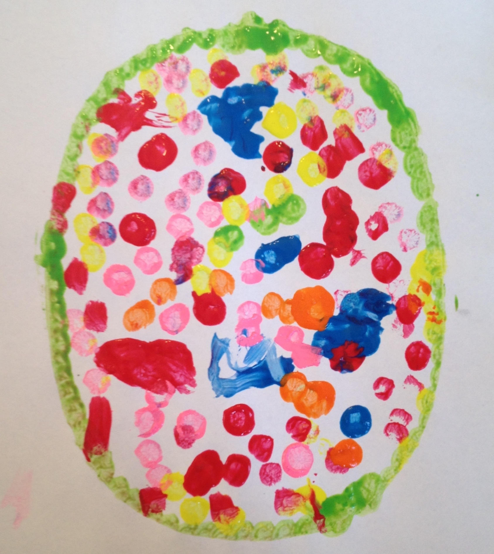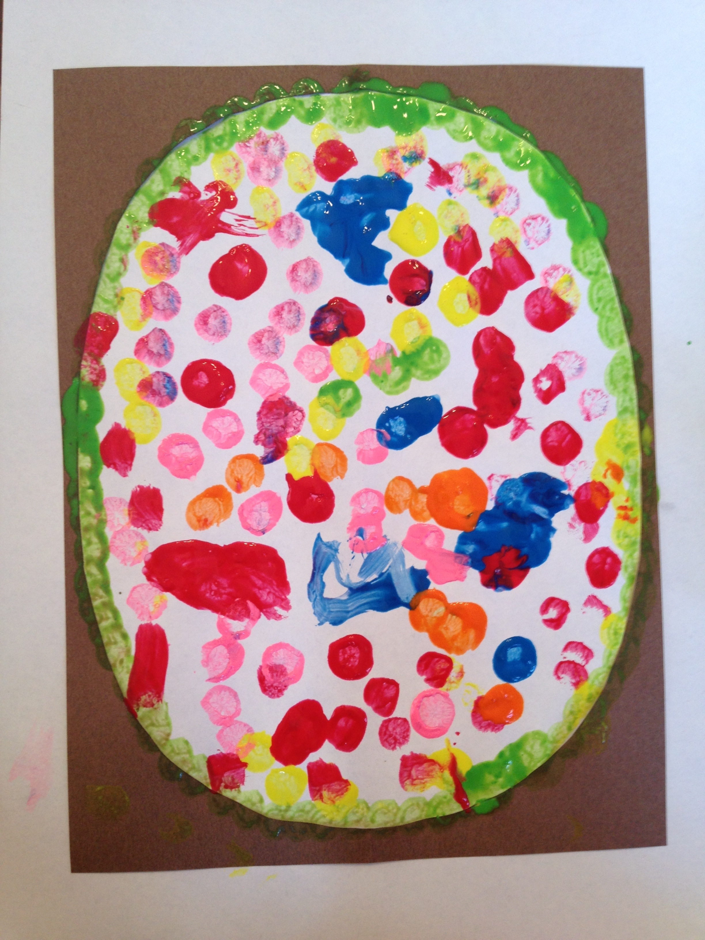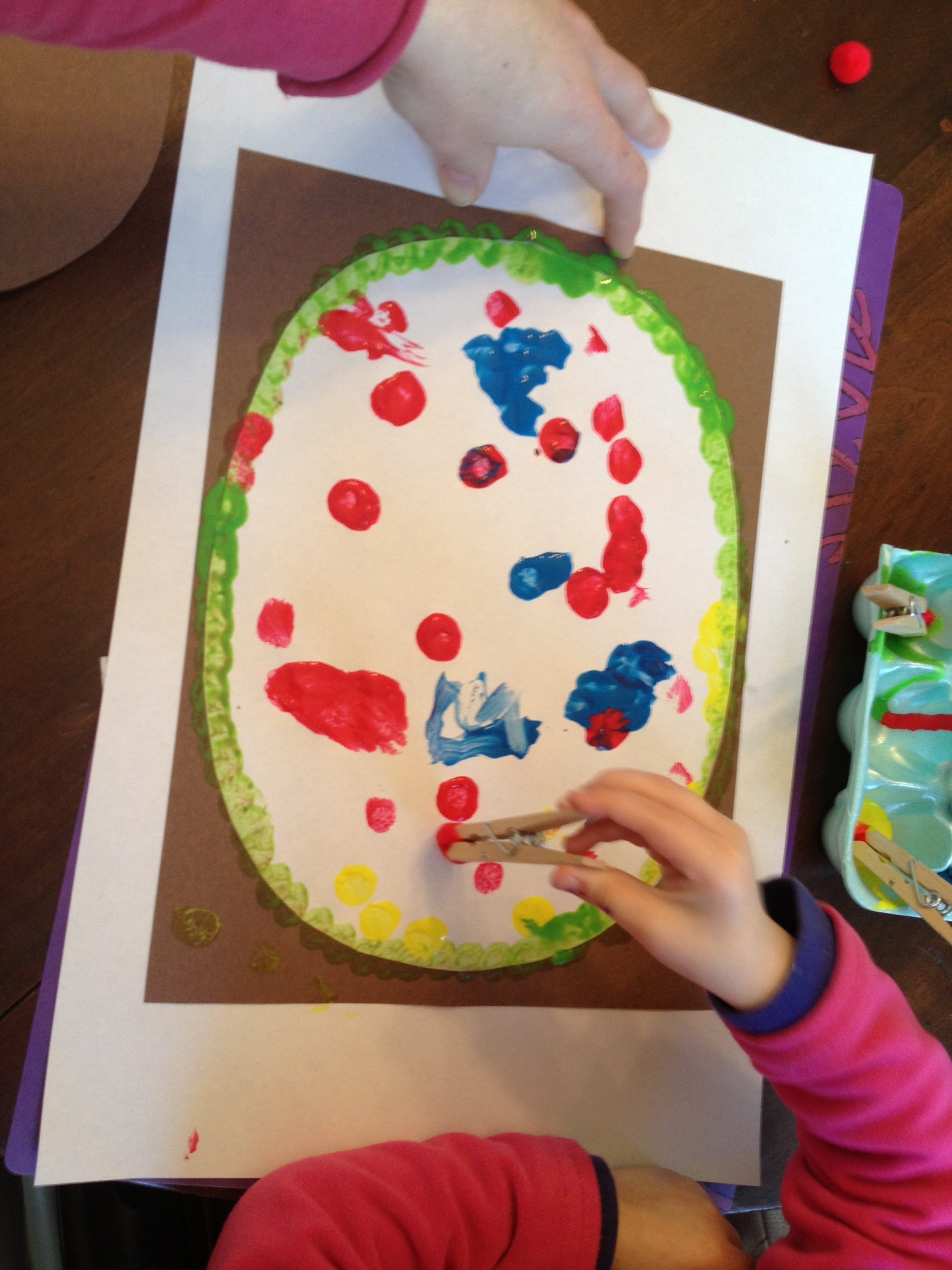 Assist your child in making dots, swirls, and whatever other designs they can create with the pinned Pom. I found that I needed to create a boarder around the edge of the construction paper because Reagan wasn’t completely filling in the egg.