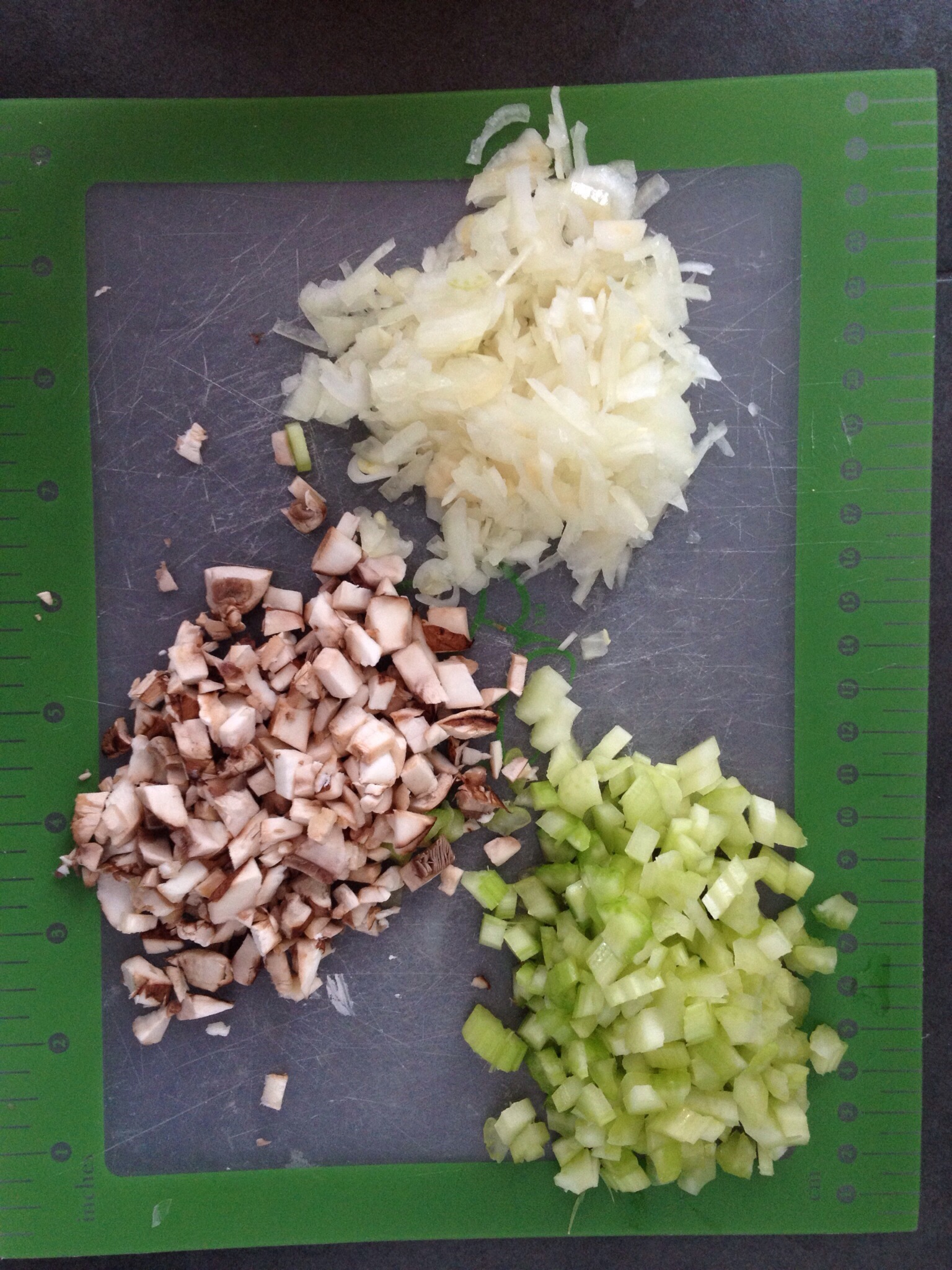 In a small skillet over medium heat, add onion, mushrooms, celery and butter or olive oil. Sauté until tender and onions are translucent.