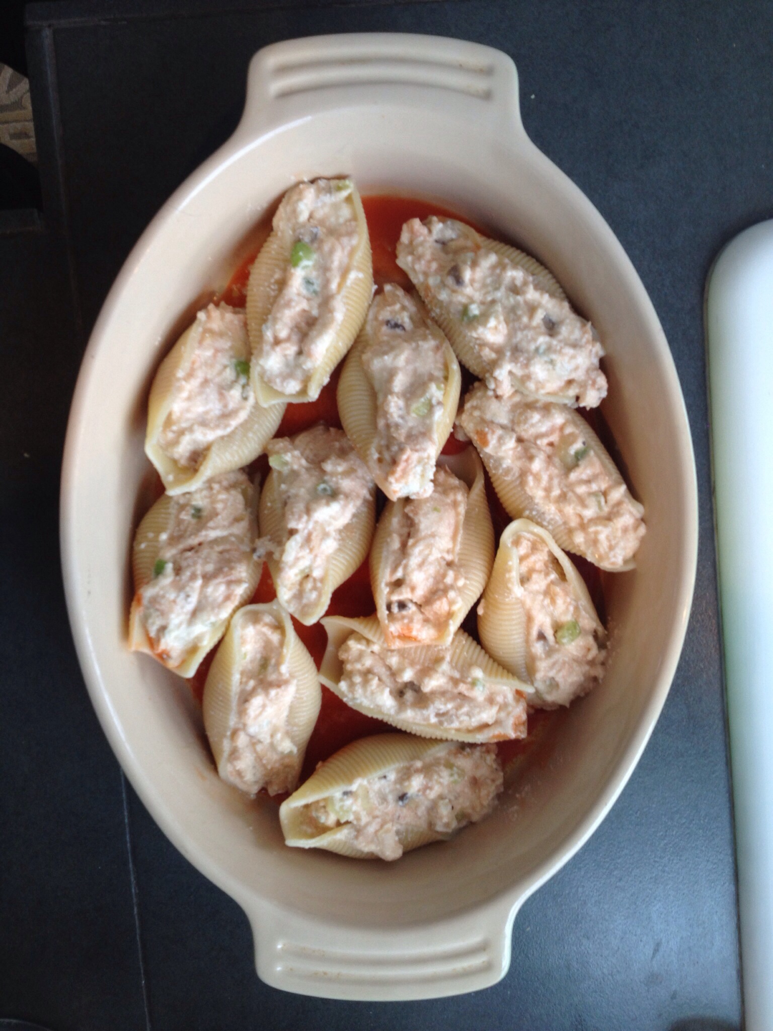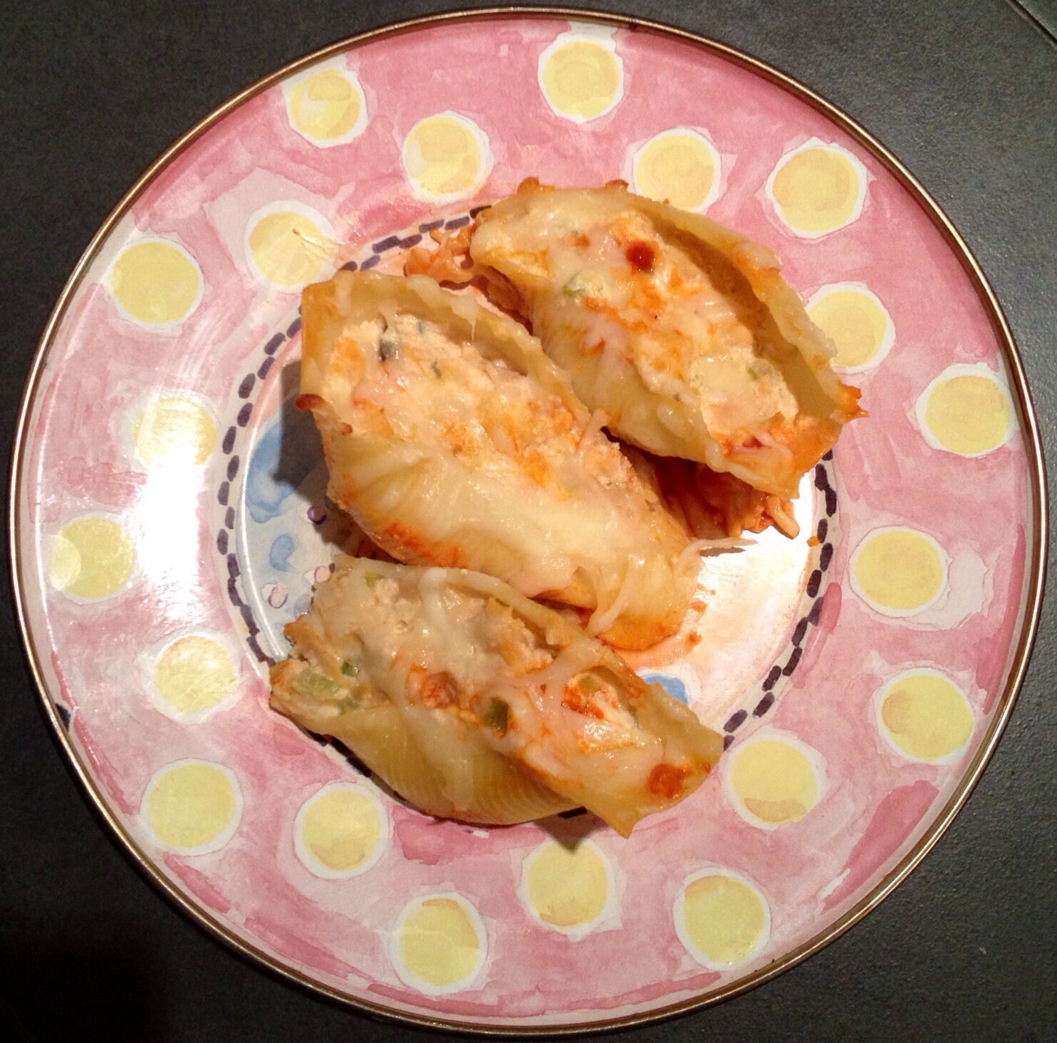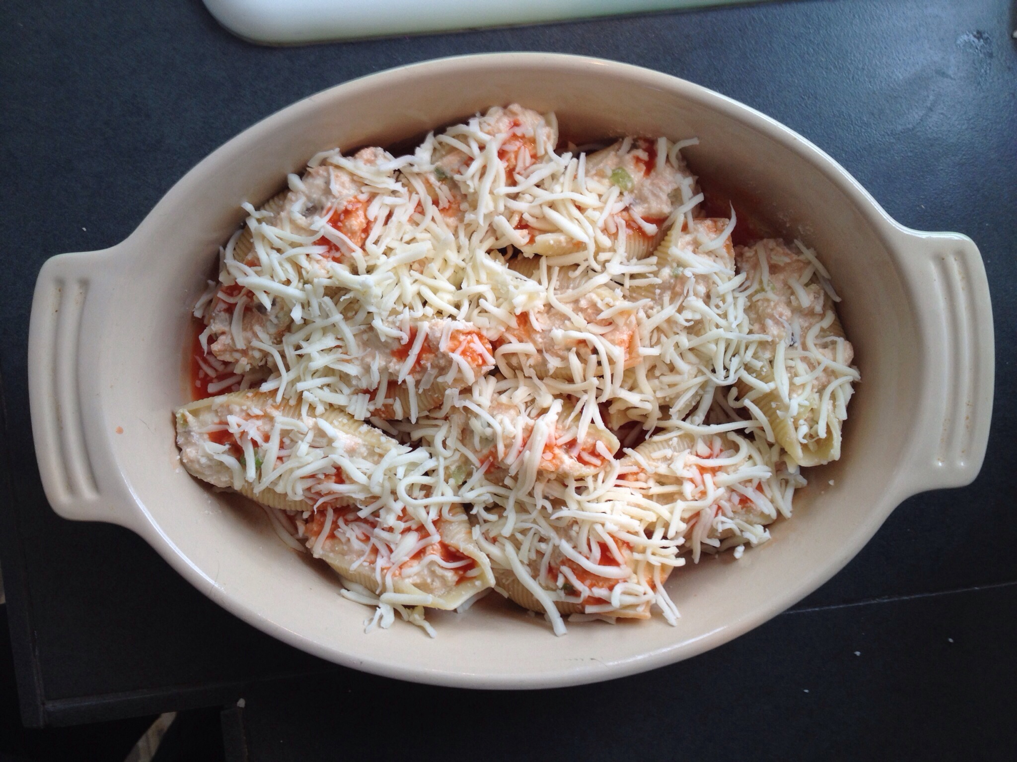 I’ve been pinning various recipes lately, in hopes to find meals that all three family members will enjoy. When I came across these Buffalo Chicken Baked Shells on Baked by Rachel, I was sure I found a winner. I added an extra chicken breast and mushrooms to the recipe. I made 22 shells, 12 I baked the night that I prepared the meal, 10 I froze to be cooked at another date.