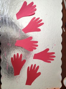 Take two cut out red hands and mod podge one side of one hand. Place one end of the arm span measured ribbon onto the mod podge and then the other hand on top (You are sandwiching the string in-between the two hand cut-outs). Press down firmly. I would recommend putting something heavy, like a book, on top of your hands until they dry. Repeat this step three times. You are only gluing one side of the string in between two hand cut-outs at this point.