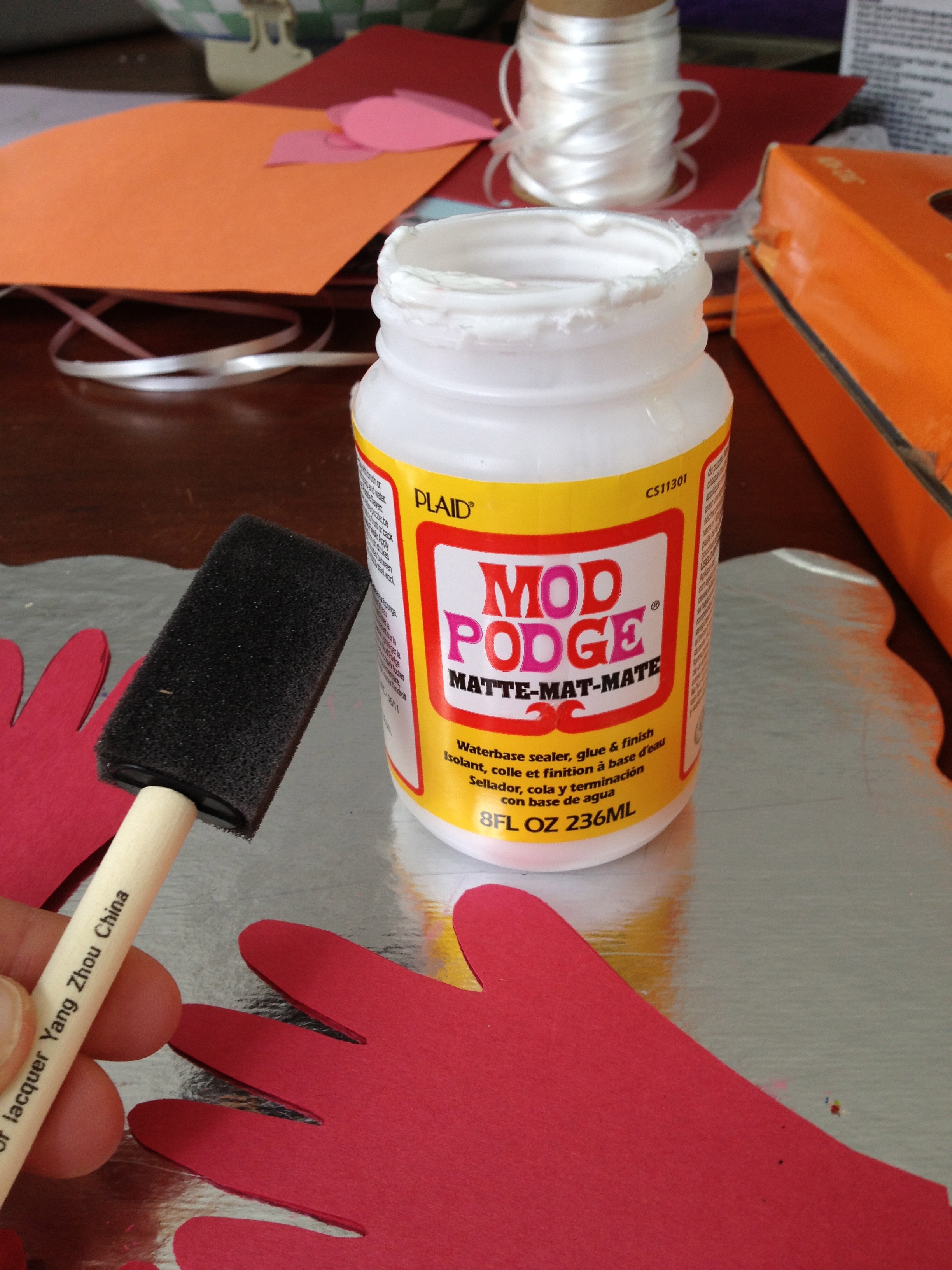 Take two cut out red hands and mod podge one side. Place the other end of the arm span measured ribbon onto the mod podge and then the other hand on top (You are sandwiching the string in between the two hand cut-outs). Press down firmly. I would recommend putting something heavy, like a book, on top of your hands until they dry. Repeat this step three times.