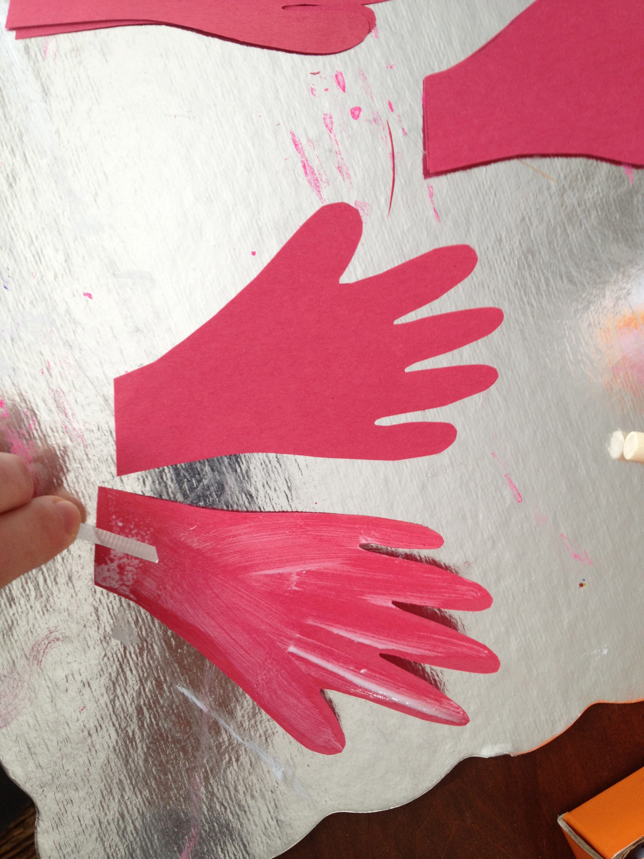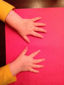 Trace cut out hand onto red construction paper. Using both pieces of red construction paper, one on top of the other, cut out traced hands. We needed six hands for our three valentines.