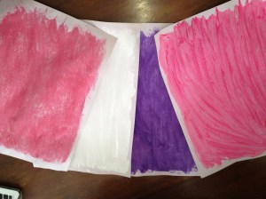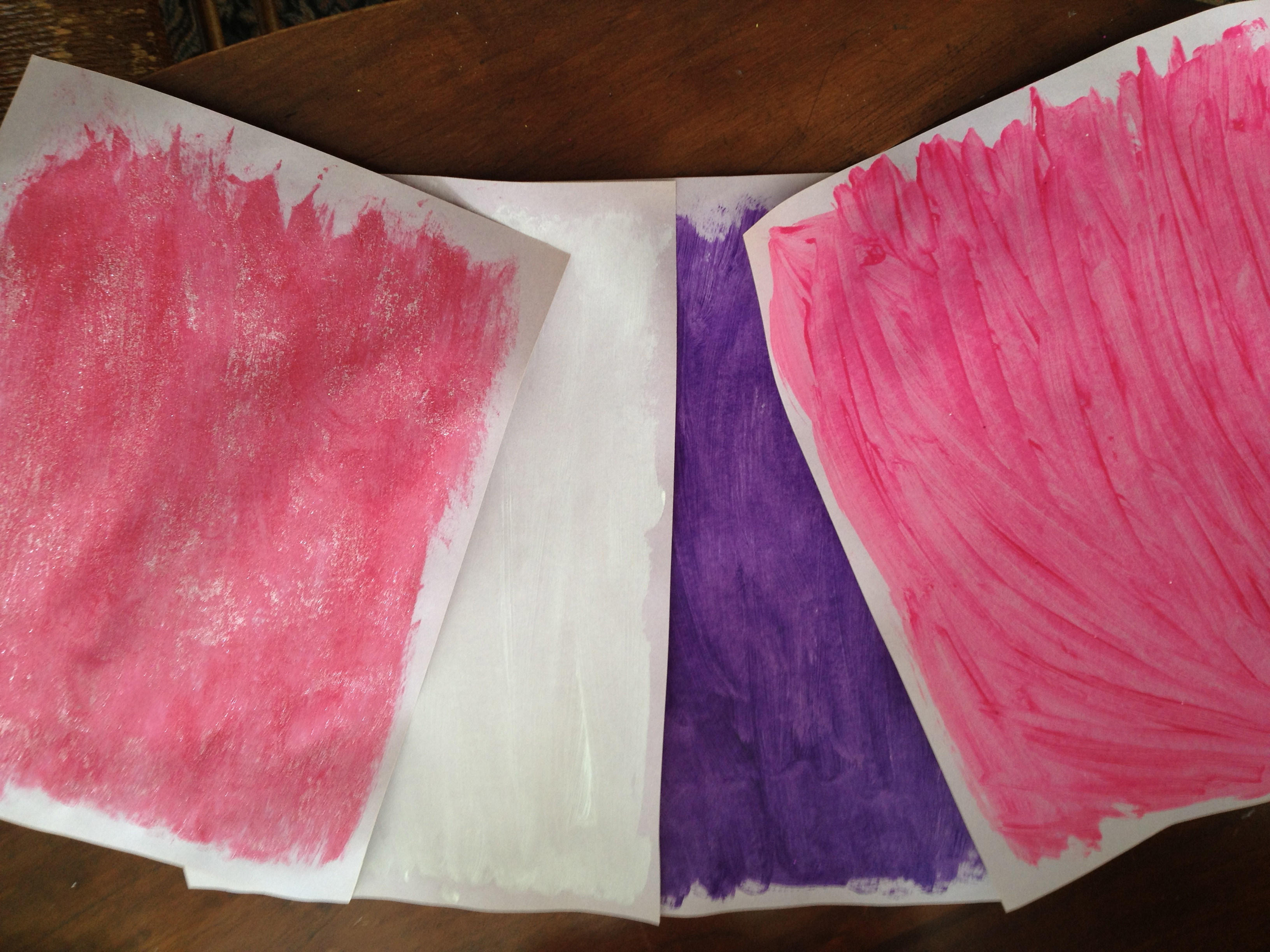 Paint both sides of the four sheets of large card stock paper- one sheet for each color (let one side dry before painting the other, this should be obvious…)