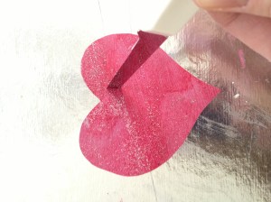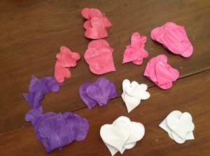 Trace the cut out index card hearts onto the 4 large painted card stock pieces of paper. Cut out the hearts. This is where it became a bit tedious…there were a lot of hearts that needed to be cut out, that I didn’t even use! These will be going into the Valentine’s box, so at least I saved myself some trouble for next year!
