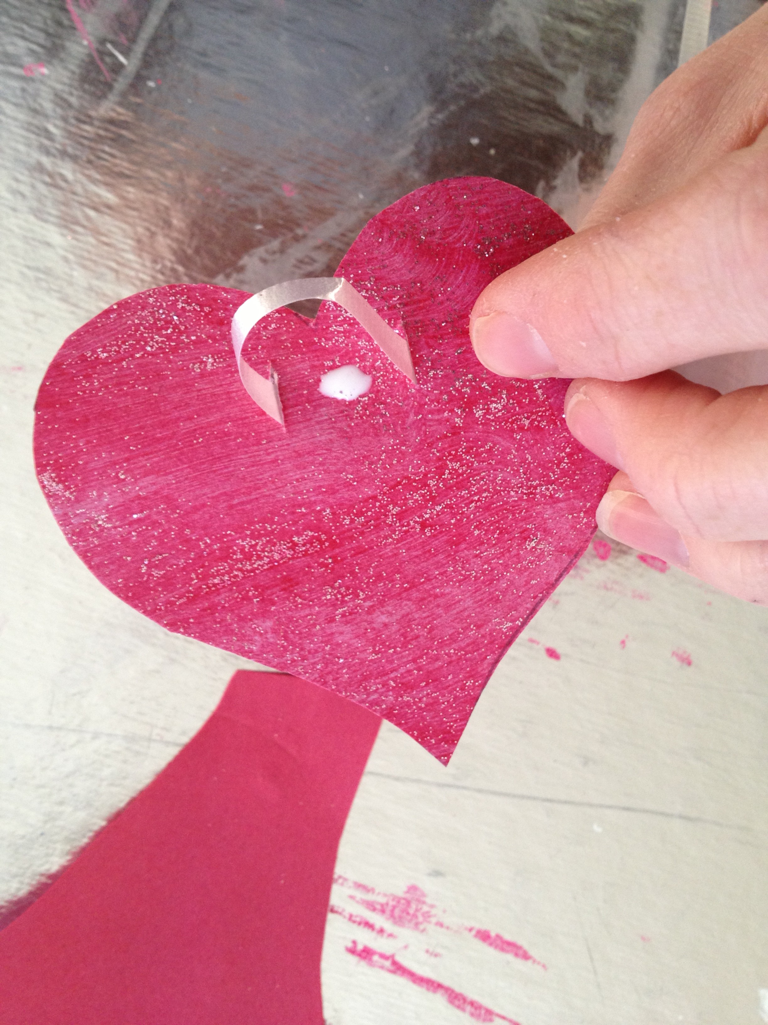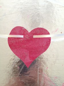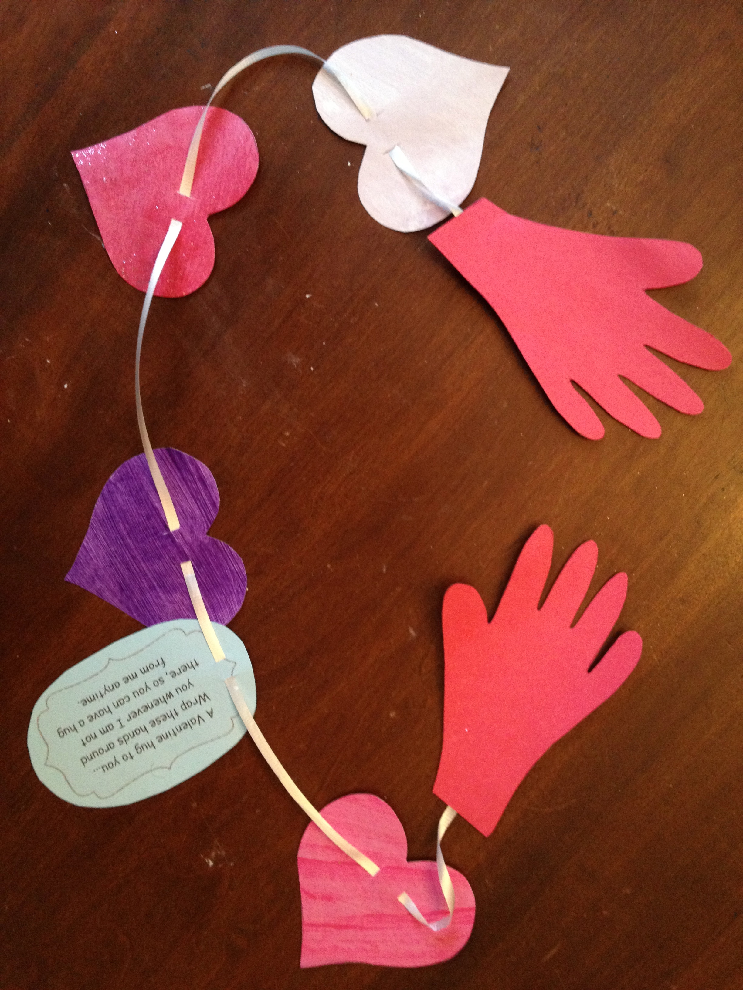Thread your ribbon through your slits and place a small dab of mod podge behind the ribbon to secure. Repeat this adding however many hearts that you want to add. We only ended up using four hearts for Reagan’s Valentine, her arm span is super short. I utilized the free printable (http://thepartyevent.wordpress.com/2012/02/05/valentines-crafts-for-kids-a-long-distance-hug-a-beautiful-present-for-someone-special-diy/), printed it on card stock, cut it into an oval and attached it to the string in the same fashion as I did with the hearts.