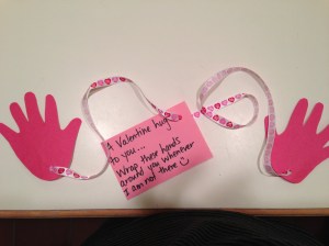 My sister, Erin, found this adorable craft on The Party Event (http://thepartyevent.wordpress.com/2013/01/30/valentines-day-candy-and-sweets-for-your-sweetheart-photo-booth-props/) and made the best Valentine’s day gift for someone very special that lives far away. I thought that it was the sweetest idea and that it would be fabulous for my husband who works long hours and often comes home after Reagan is already in bed. This Valentine is perfect for when he misses her and needs a hug.