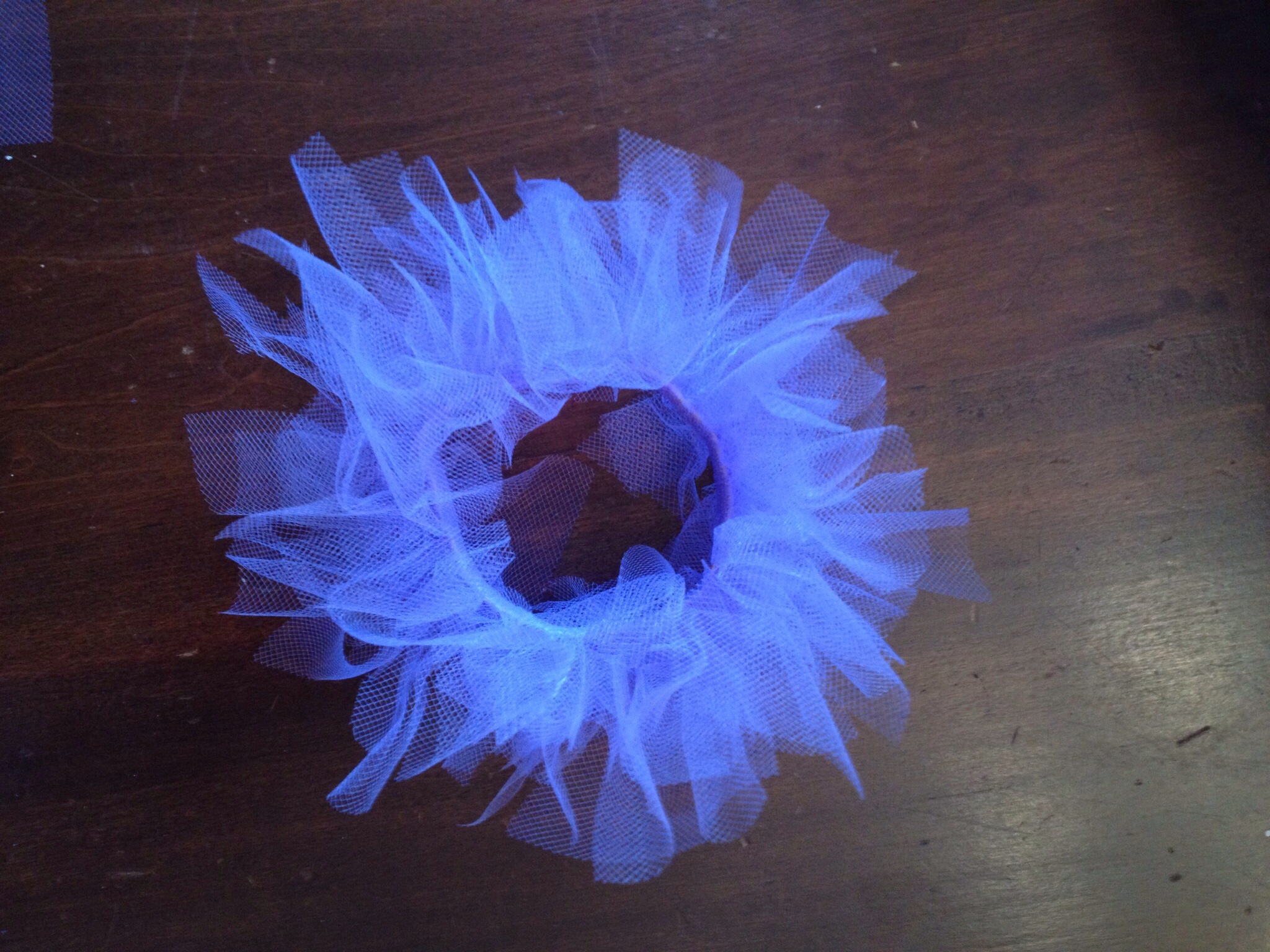 Tie individual pieces of tule to the rubber band. Make sure that the pieces of tule are tied close to each other, so that the rubber band cannot be seen. Continue around the entire rubber band.