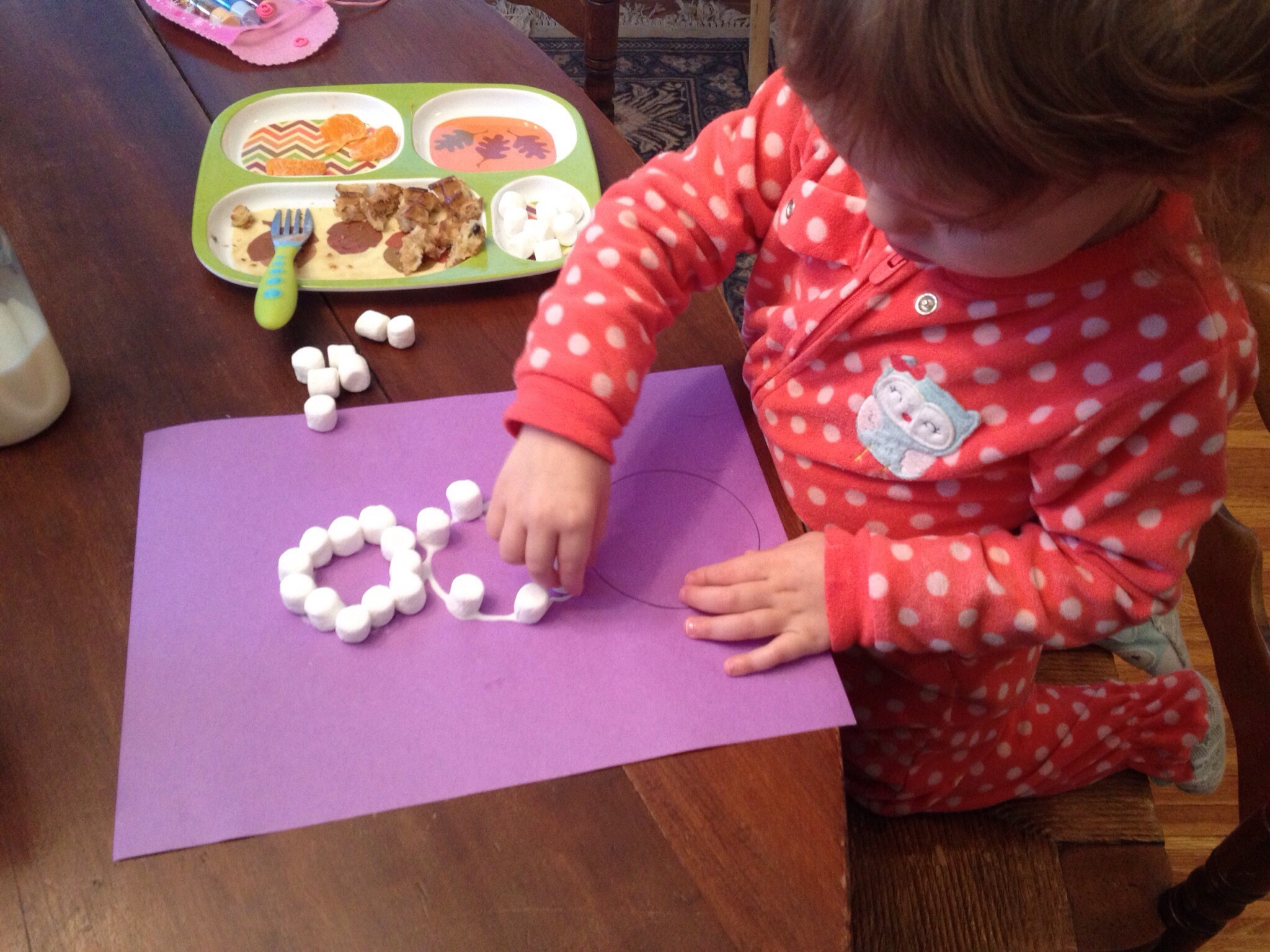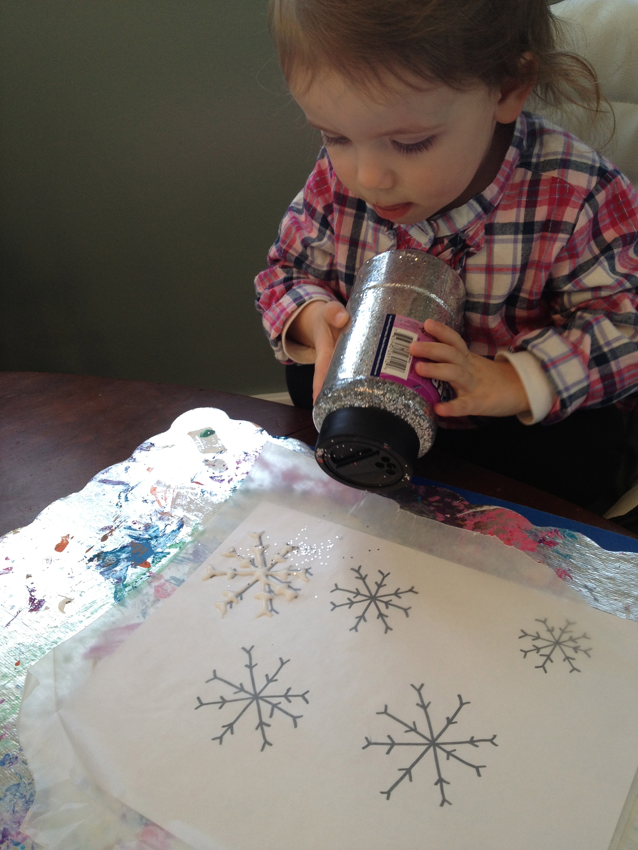 These snowflakes, originally found here, were super easy to make, but took a long time, 15 plus hours to dry. The plan was for this to be a craft for Reagan and I to do on a super chilly, 9 degree, day here in Rochester. Unfortunately, the only part of this craft that Reagan was able to participate in was the shaking of the glitter onto the glue. She wasn’t super disappointed, and luckily I still had left overs on hand from a Snow Man craft that we did a week or so back.